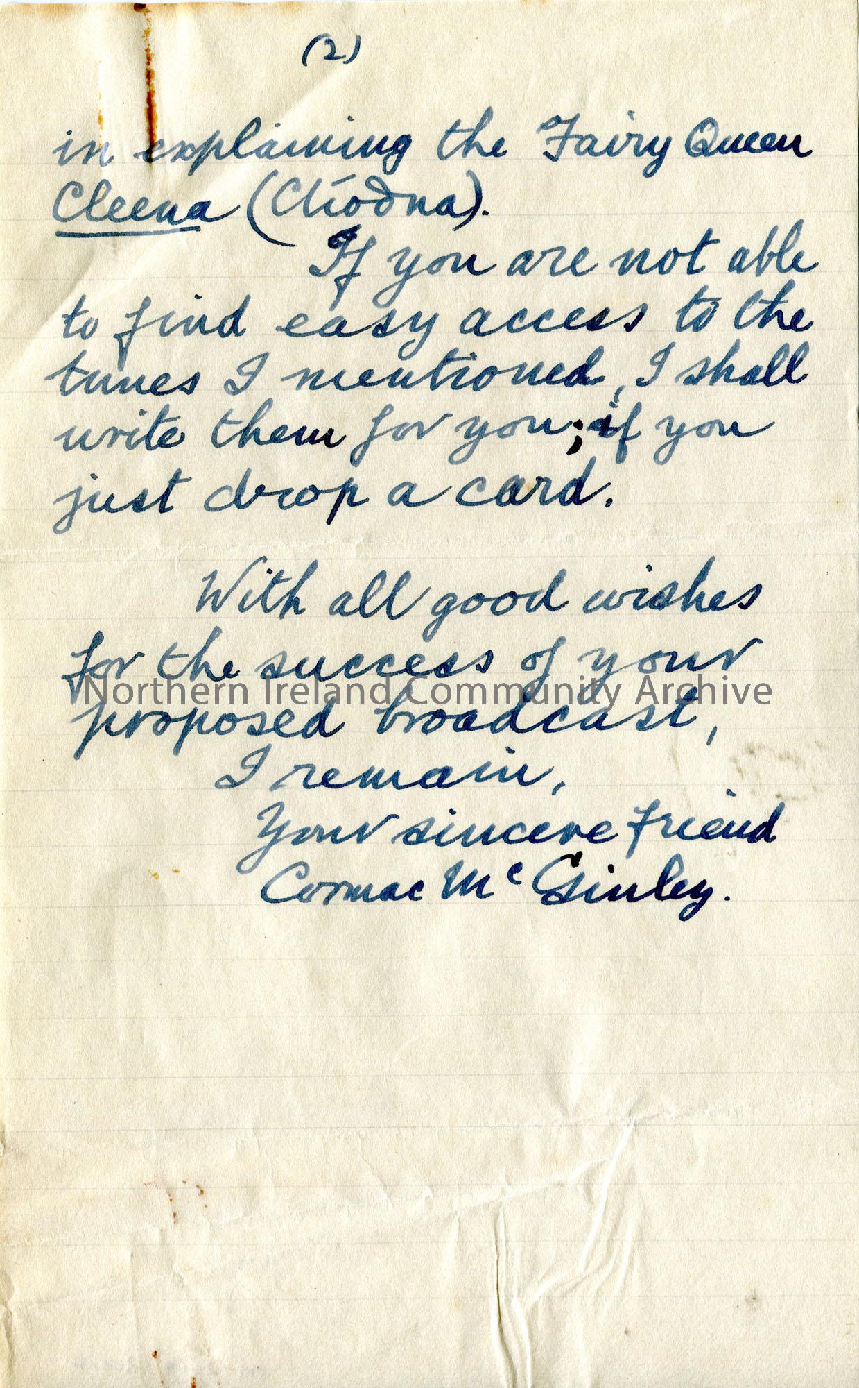 Page 2 of 2. Handwritten letter to Sam Henry from Cormac McGinley. Searched the National Library of Ireland for Sam re the song ‘An Irish Mother’ with…