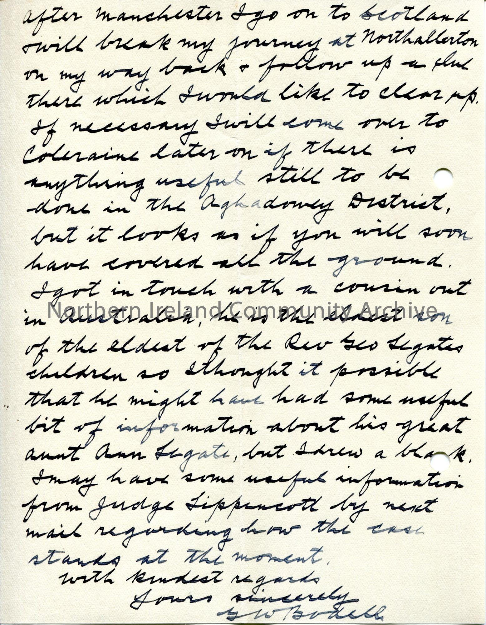 Page 2 of 2. Handwritten letter to Sam Henry from G W Bodell. Replying to a letter from Sam of 6th October. Re genealogy search of surnames Legate and…