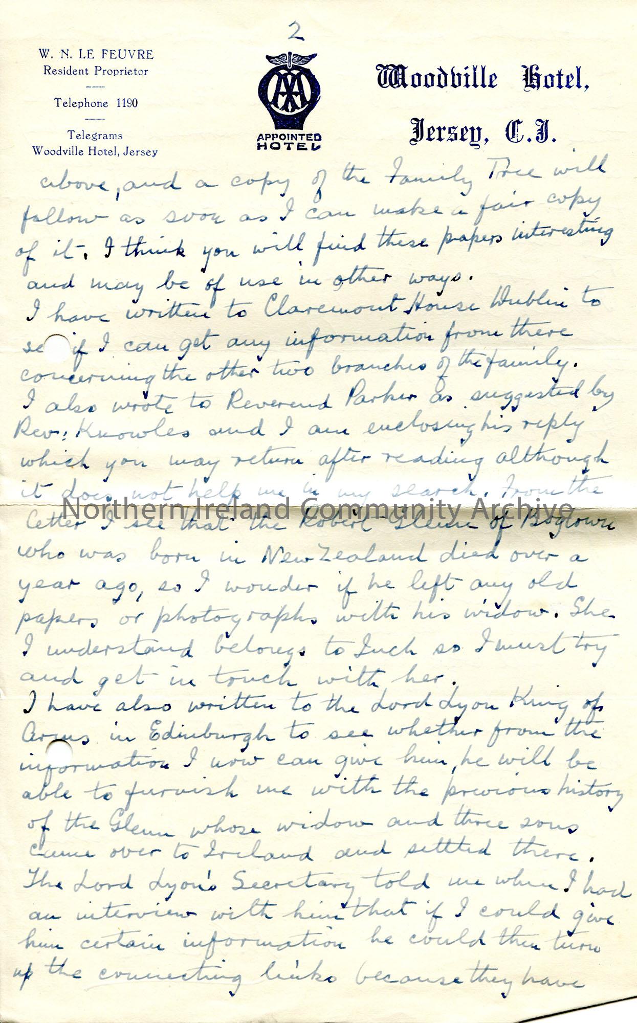 Page 2 of 2. Handwritten letter to Sam Henry from H Glenn. Notes his inability to go back to Gibraltar due to unrest in Spain. Updates Sam on his family history research re surname Glenn. Asks Sam to keep helping him with the research.