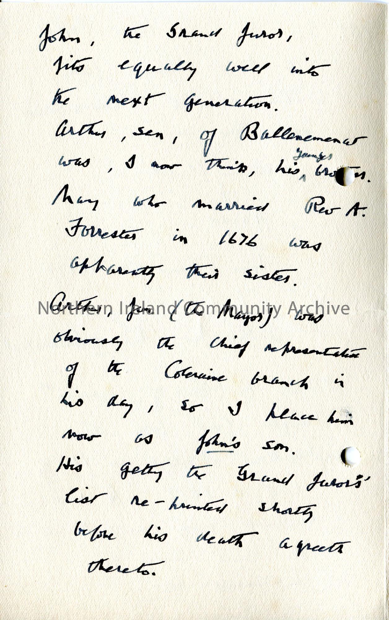 Page 2 of 2. Handwritten letter to Sam Henry from Wilfrid Abbott. Sam had sent him negatives which he got enlargements of. Thinks Sam is getting his Chronicle articles published in book form. Refers to the town of Coleraine and Thomas Church, Agent of the Mercers, early 1600s. and his descendants. Refers to Church family involvement on the Siege of Derry.