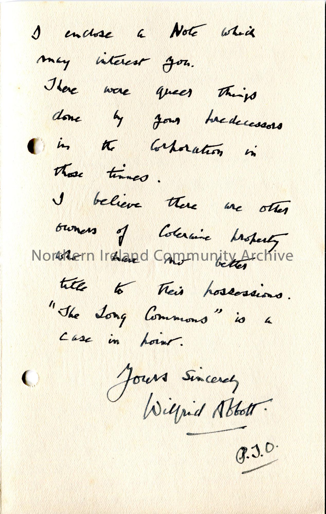 Page 2 of 2. Handwritten letter to Sam Henry from Wilfrid Abbott. Sam had sent him negatives which he got enlargements of. Thinks Sam is getting his Chronicle articles published in book form. Refers to the town of Coleraine and Thomas Church, Agent of the Mercers, early 1600s. and his descendants. Refers to Church family involvement on the Siege of Derry.