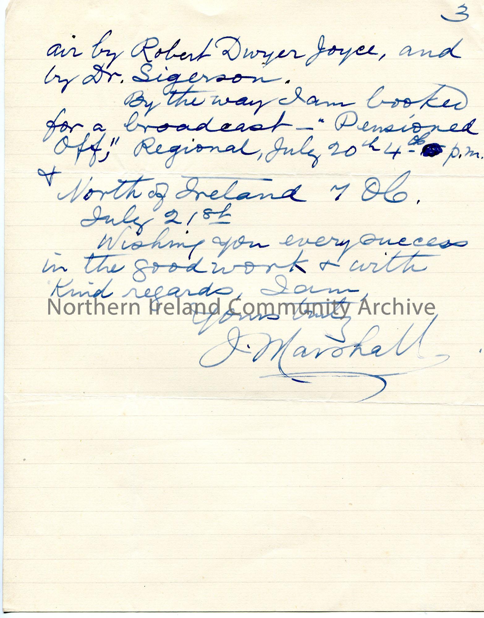 Page 2 of 2. Handwritten letter to Sam Henry. Re Shane Bearnagh [Bearnach]. Understands that Shane Bearach's surname was also Donnelly. Sam to contact Rev J W Johnston of Townsend Street. Encloses notes re Altmore Barracks. He has the words of the original ballad of 'The Mountains of Pomeroy' and air written by Robert Dwyer-Joyce and Dr Sigerson. He has a scheduled broadcast 'Pensioned Off' on 20th July.