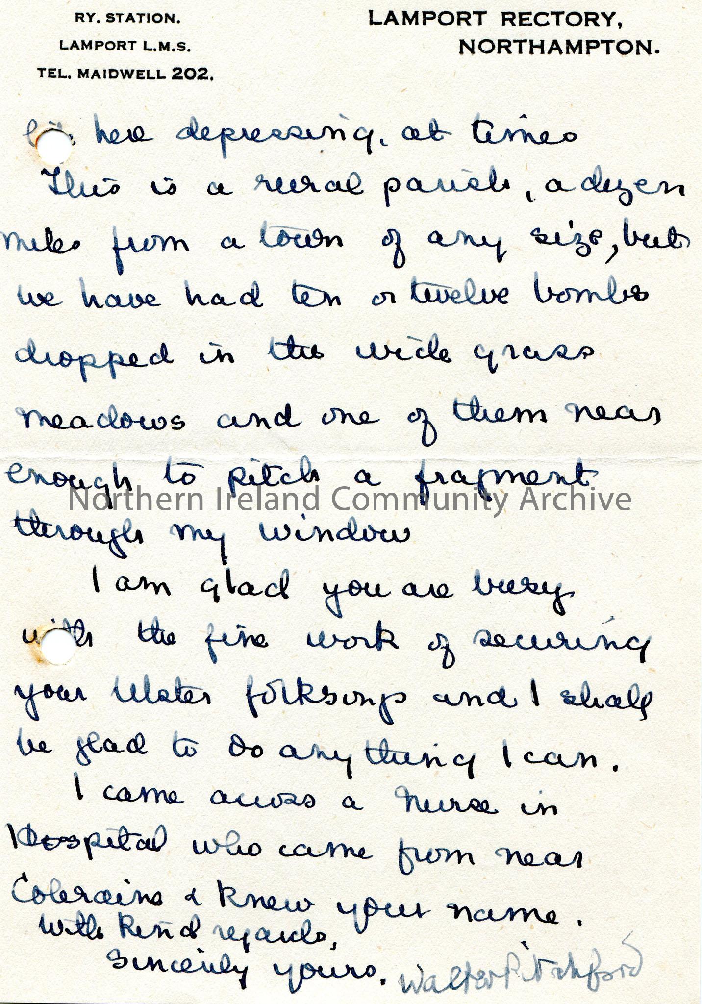 Page 2 of 2. Handwritten letter to Sam Henry. To send Sam his arrangement of the songs he collected. Currently resting after a period in hospital. Glad that the BBC have secured Sam's work. Mentions wartime rationing, blackout and the dropping of bombs near his Parish.