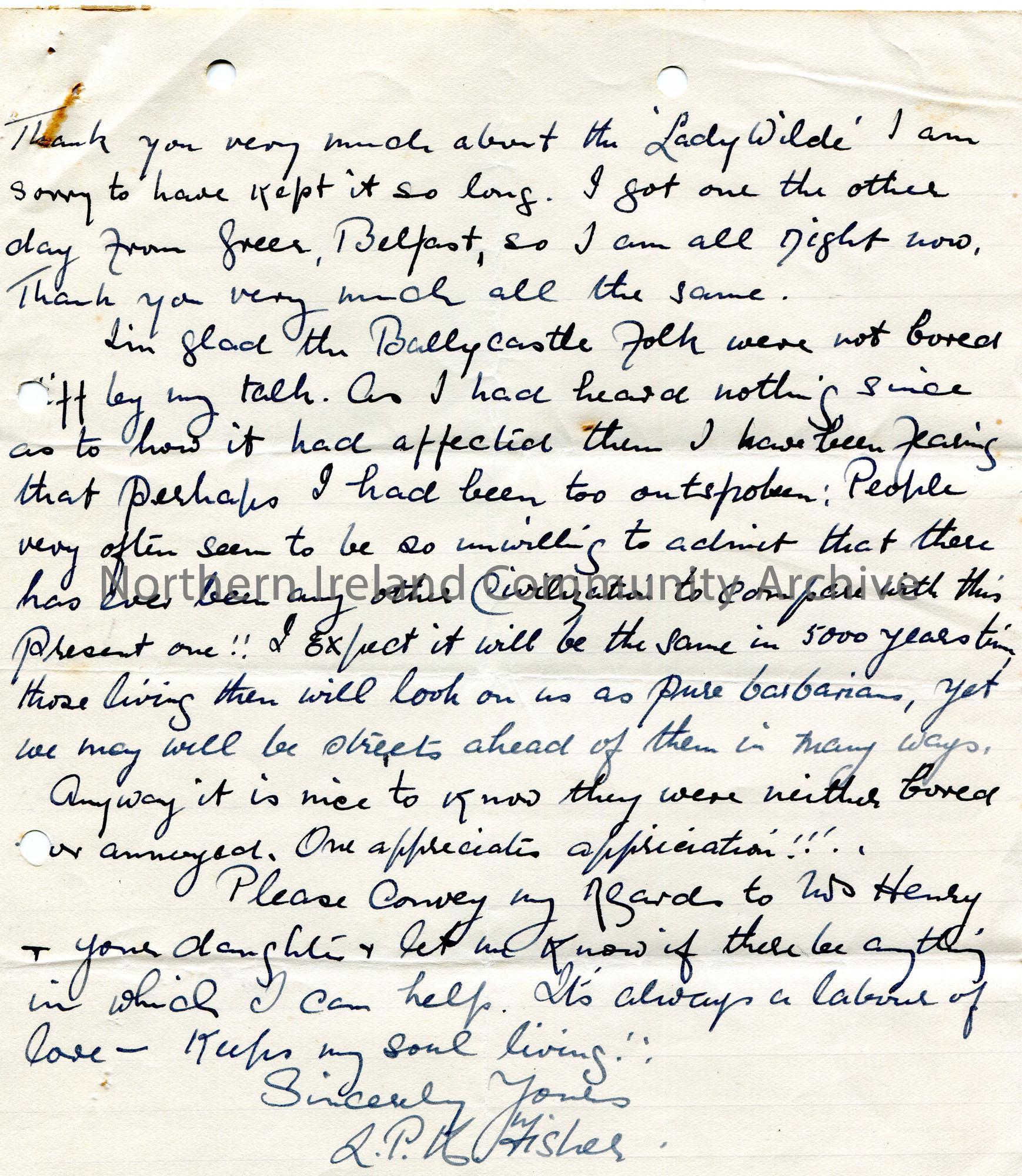 Page 2 of 2. Handwritten letter to Sam Henry. Tries to answer Sam's query re which Egyptian Goddess had a seven pointed star as her emblem. Small drawing in ink of an Egyptian Goddess at side of page. Writes that he held a talk in Ballycastle. Cannot understand why people do not believe in other Civilisations. Glad to be of more help to Sam if needed.