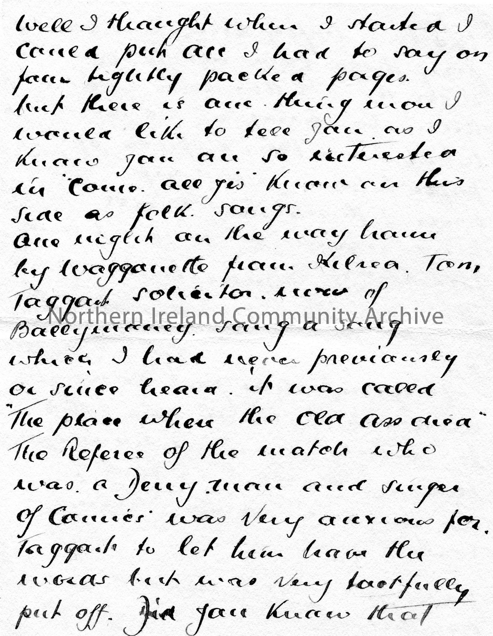 Page 2 of 2. Handwritten letter to Sam Henry. Writing re broadcast by Sam re Percy French. Disappointed to have missed Sam's talk on the Glens of Antrim from Athlone. Likes to keep an interest in Coleraine by reading the 'Chronicle' now and again which is sent to them. Mentions the Magee Cup. Reminisces about people he has met and places he has been. Writes of ships damaged during the war held in the dry dock. Mentions a solicitor Tom Taggart of Ballymoney who sang 'The Place where the Old Ass died'. They still have the photo of their children in the donkey cart which Sam took.