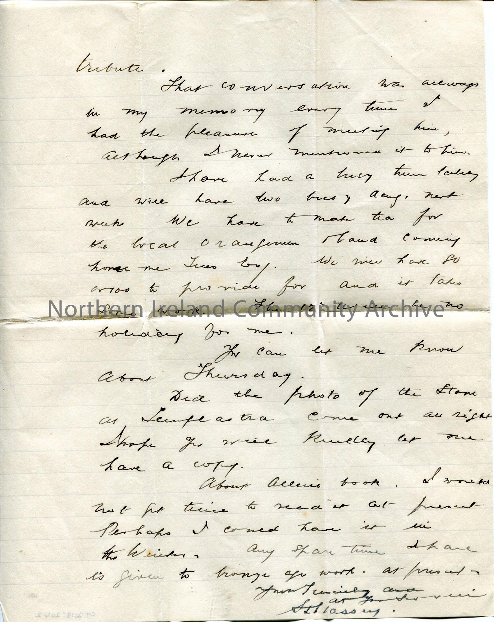 Page 2 of 2. Handwritten letter to Sam Henry. Writing re the death of Sam’s brother, William, Town Clerk of Coleraine. Also writes of arrangements for…