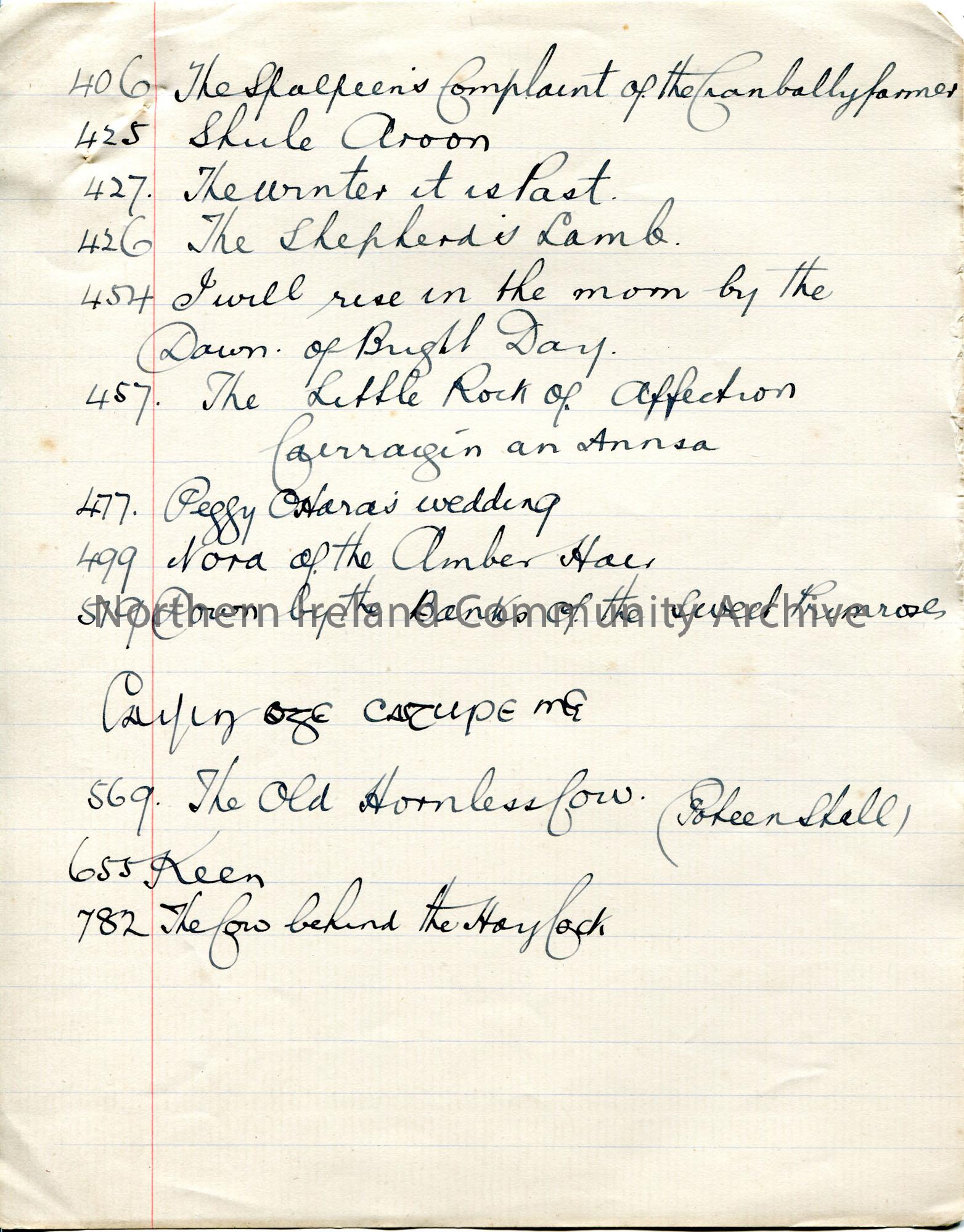 Page 2 of 2. Handwritten list of Irish airs. Titled, ‘Land of death. 3100 Irish airs in print’. Begins with 61.The new mown meadows and ends with 782….