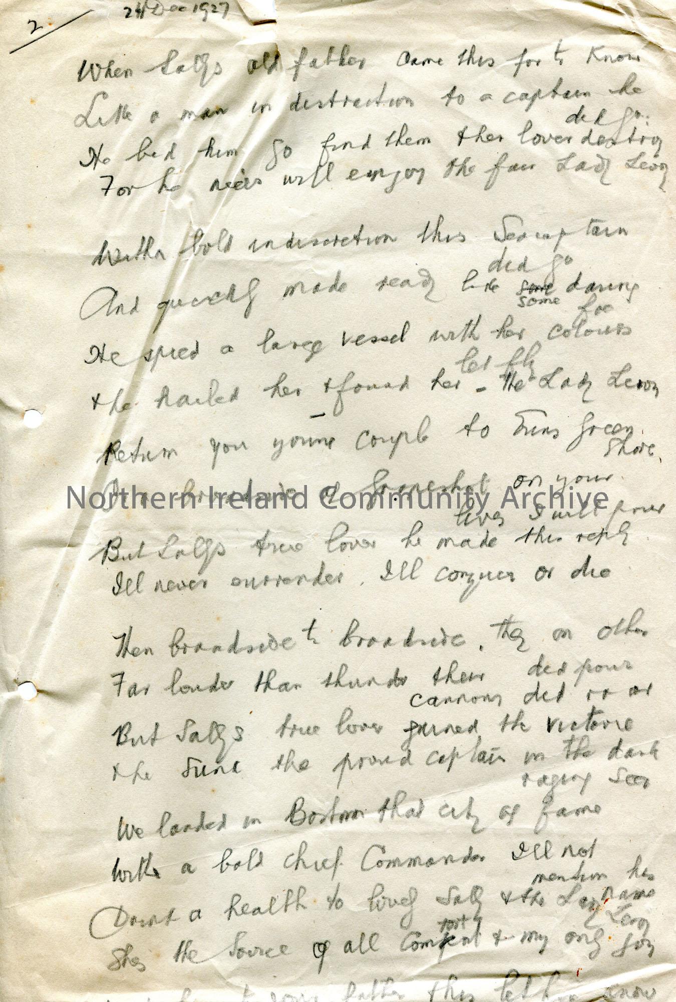 Page 2 of 2. Handwritten words in pencil to song titled, ‘The Lady Leroy’. Dated 24th December 1927. The song title is the name of the ship they saile…