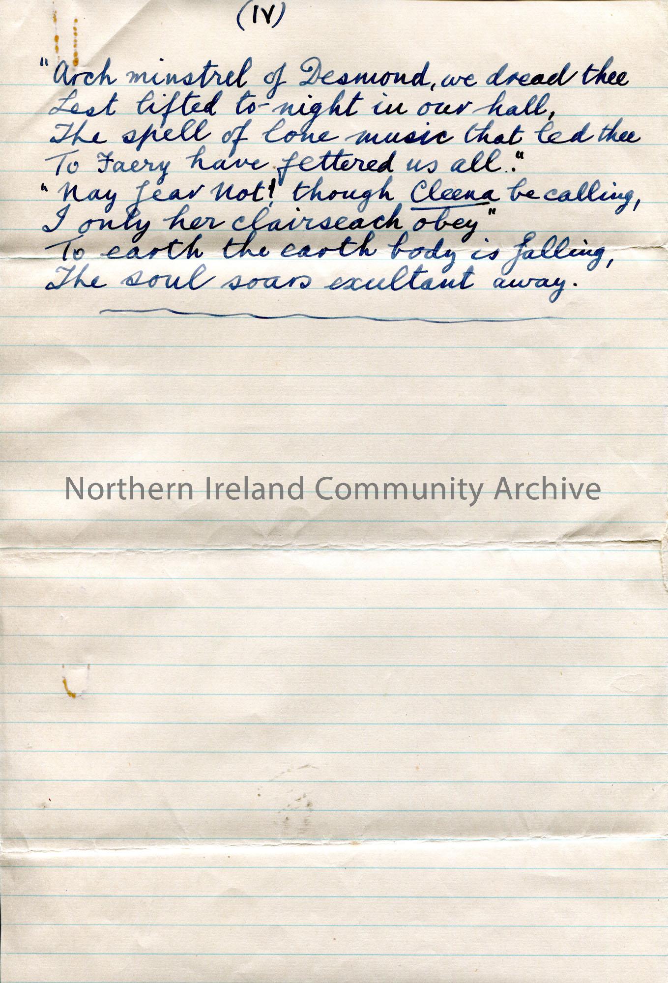 Page 2 of 2. Handwritten words to song 'The Magic Mist' as in 'Irish Folk Songs', Boosey & Co., 1897. Words by Alfred Graves and music by Chas. Woods. Mentions 'Cleena' the Fairy Queen - see CM:2019:300.1-2.