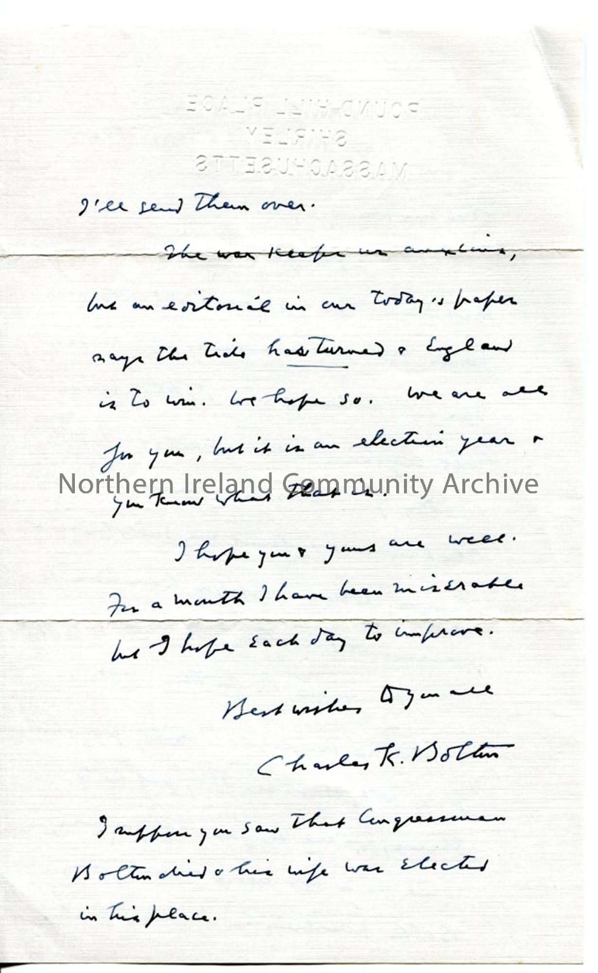 Page 2 of 2: Handwritten letter from Charles K Bolton. Congratulates Sam on book 'to preserve old Ulster' and thanks him for information on the Bolton family line in Tamlaght O'Crilly. WWII - tide has turned and England is to win. Dated 25.9.1940.