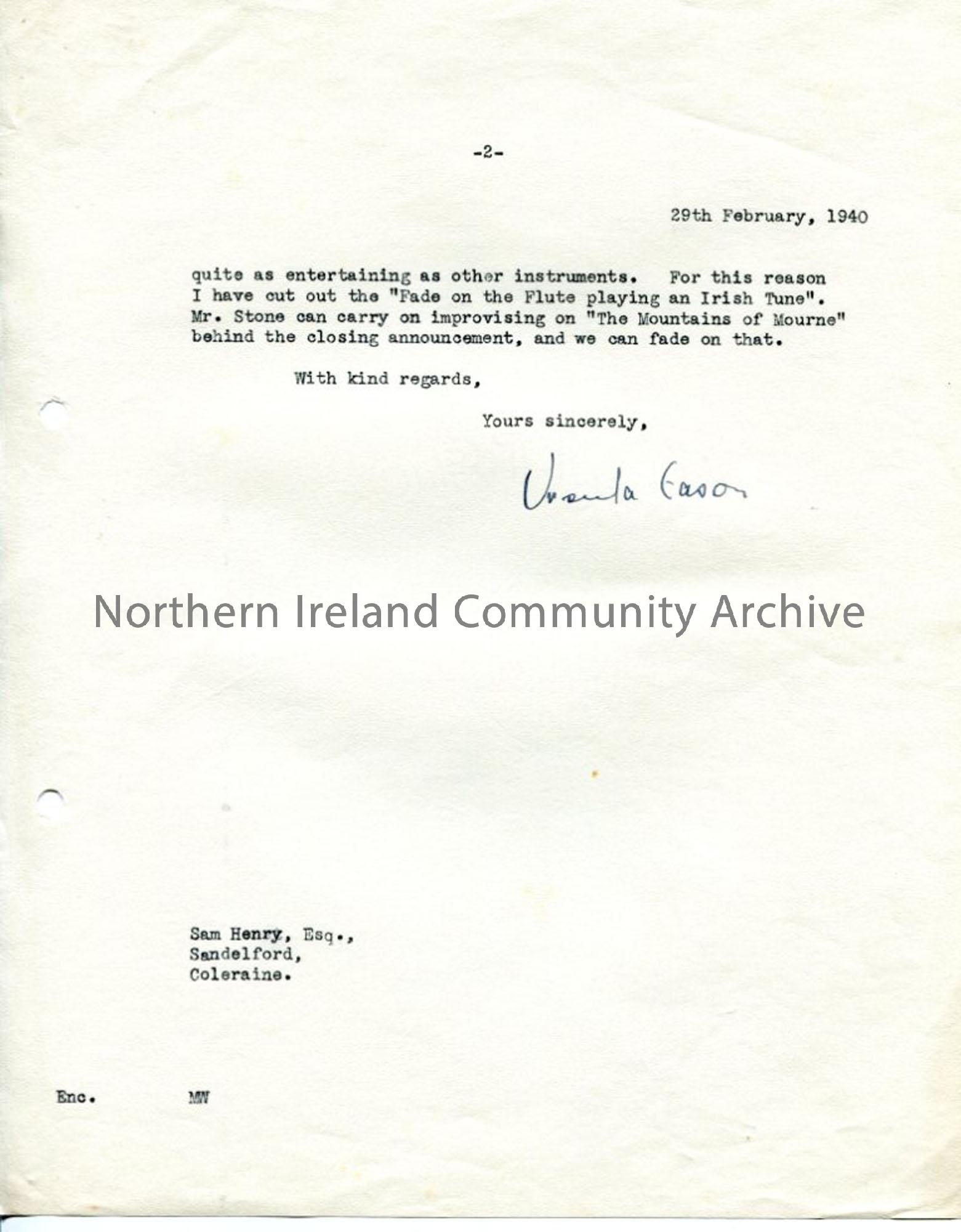 Page 2 of 2 typed pages of letter on BBC headed notepaper from Ursula Eason. Thanks for script and songs for 'Phil the Fluter' - cuts made to script, other arrangements for programme - about Percy French. Dated 29.2.1940.