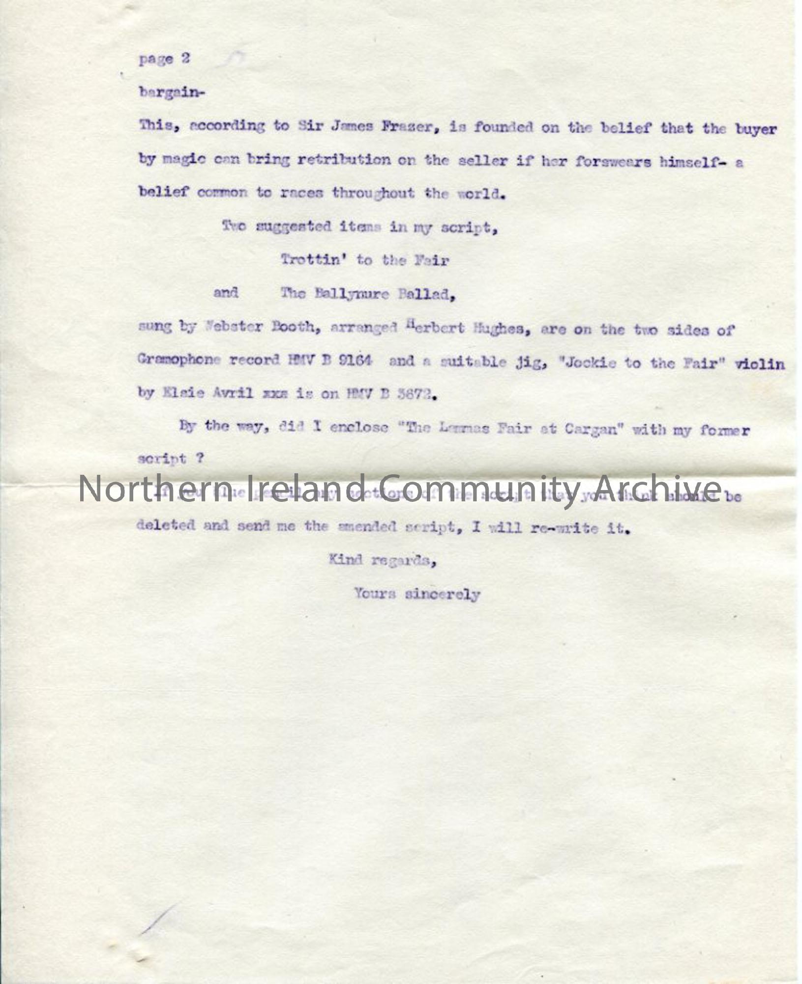 Page 2 of 2 - typed letter to Miss Eason (Ursula Eason, Sam's contact at BBC in Belfast) with suggested amendments to 'Songs of the Irish Fairs' broadcast script and information on facts and traditions associated with fairs. Dated 29.1.1944.