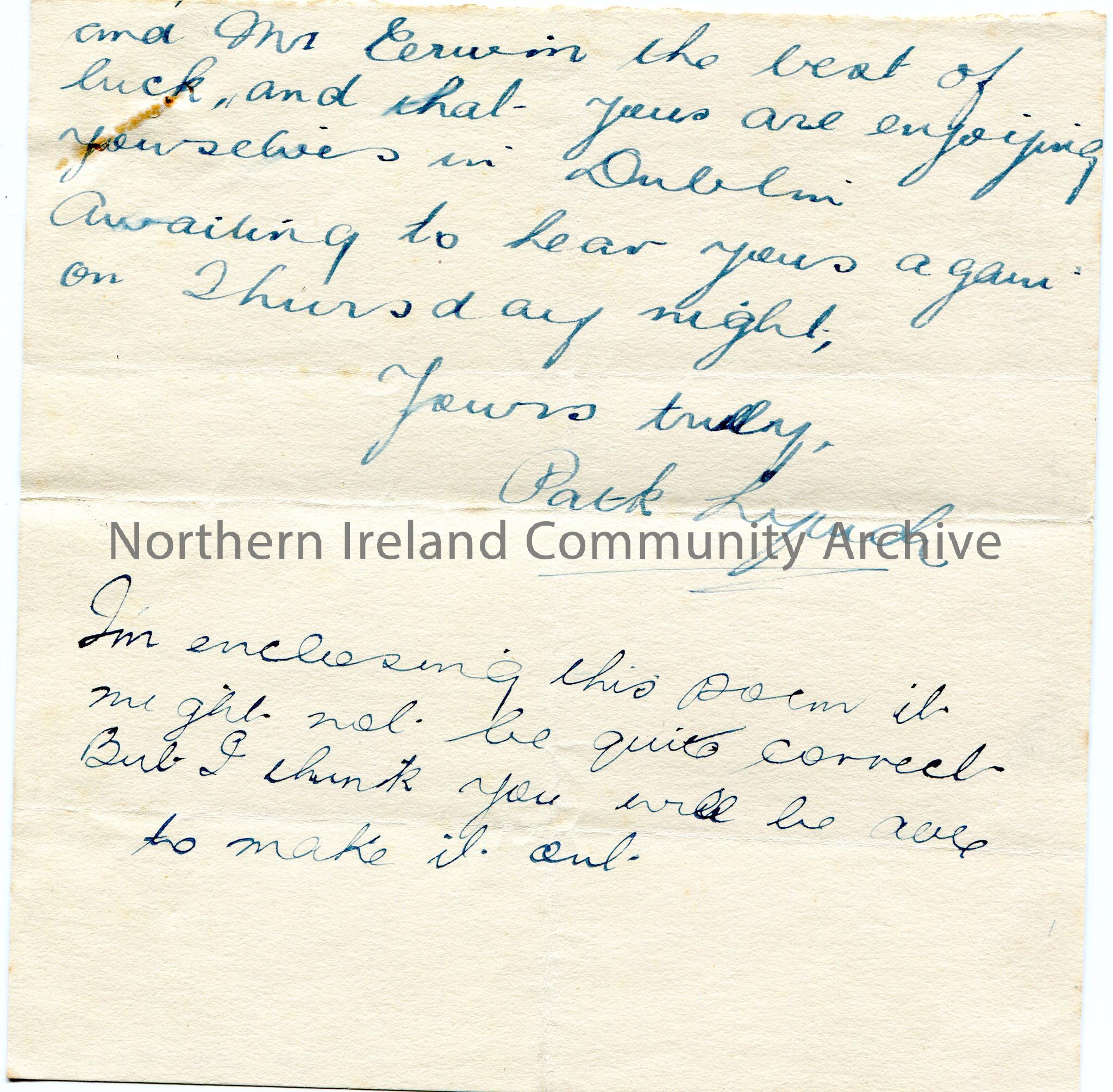 Page 2 of 2 of a handwritten letter from Jack Lynch to Sam Henry praising him and Mr Irwin for a broadcast in Dublin. Reference to James McCloskey.