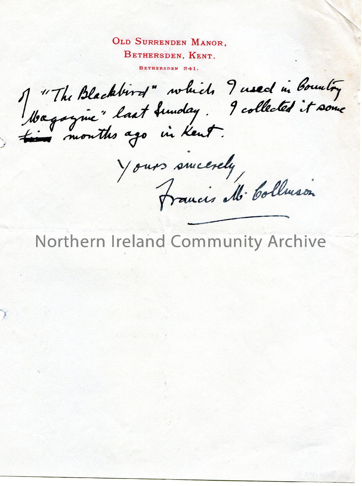 Page 2 of 2 of a handwritten letter to Mr Henry. Writes of seeing Sam's collection amongst papers left by the late Rev. W Pitchford. He would be happy to purchase copies from the collection. He too collects songs and does so in England and his native area of Scotland. Collects similar songs to Sam but mostly with different words and tunes. Sam has given permission for a song to be published in the 'English Folk Dance and Song Society' journal. Talks of changing the songs from sol-fa notation to staff notation. He presents folk songs on the radio and will bear Sam's fees for use of his songs in mind if using them. Mentions folk songs 'Not the Swan on the Lake' and 'The Blackbird'.