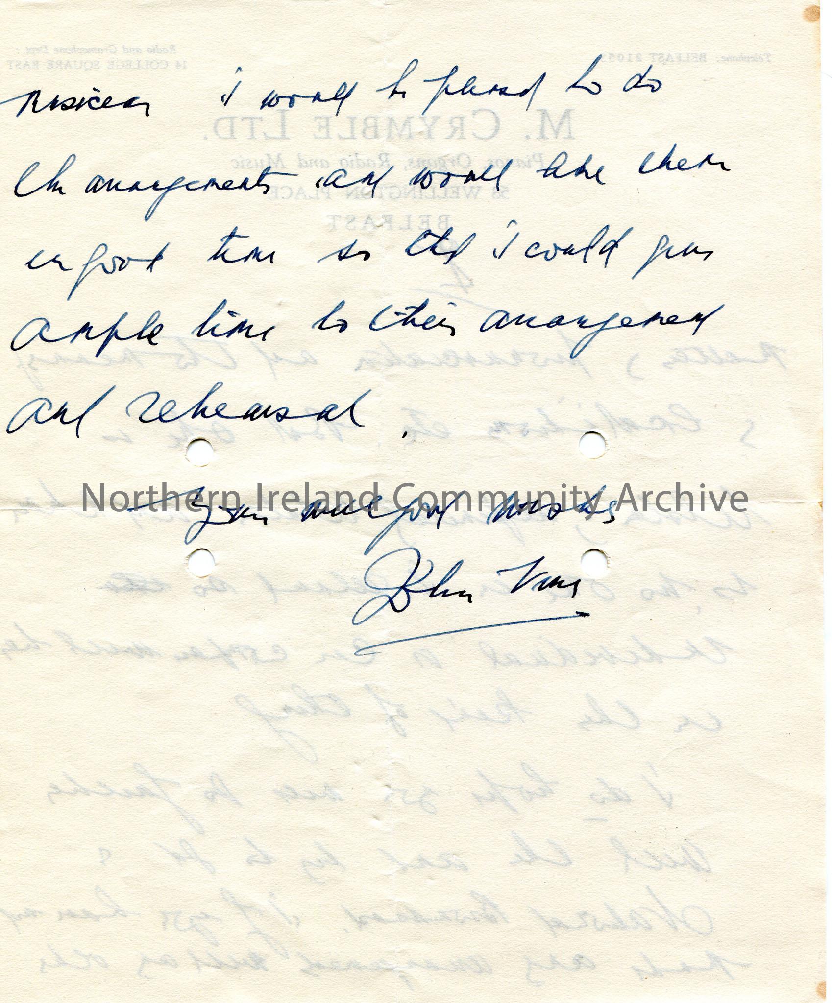 Page 2 of 2 of handwritten letter (double sided) to Sam Henry. Congratulates Sam on his broadcast last night. Asks Sam to send a script and melodies. Writes that Nan [Shaw] was magnificent and that Sam has found his singer for the songs. Would be pleased to do arrangements for songs.