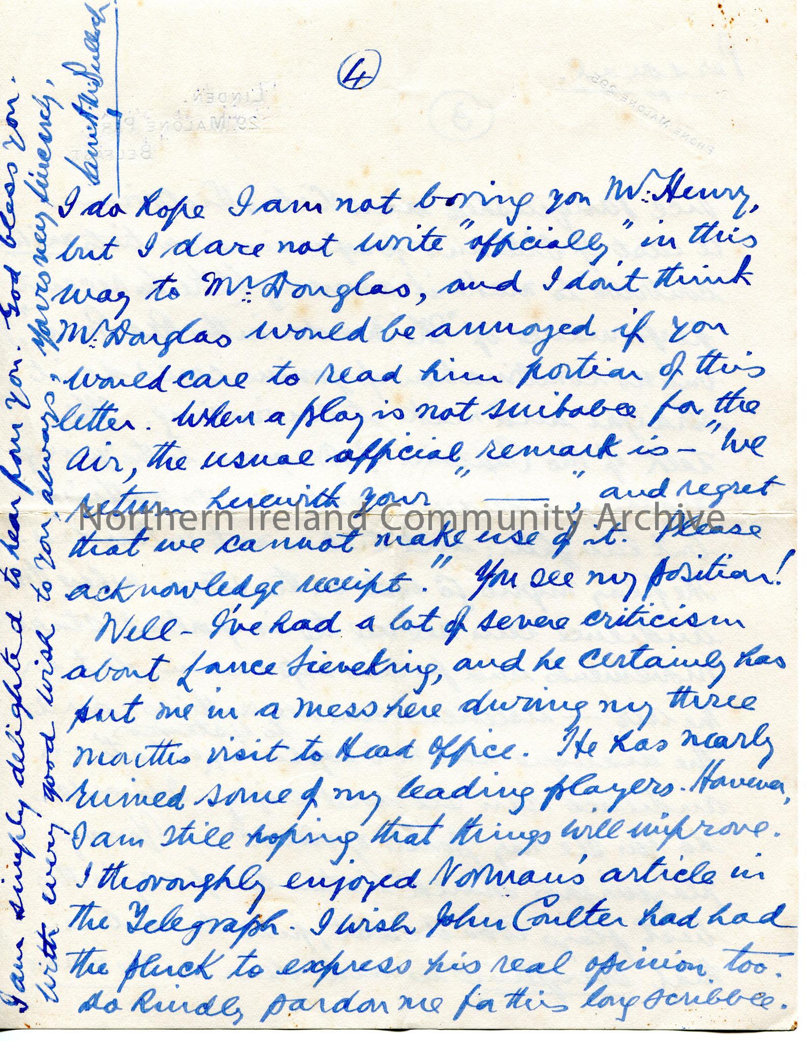 Page 2 of 2 of handwritten letter (double sided) to Sam Henry. 'Personal' written at top of pages. Number '3' written in pencil in top corner of pages. Thanks Sam for the letter and poem. Mutual friend of George Shiels. Tells Sam they continually put his name to the local Programme Board who put him in touch with the BBC. He was based in Head Office, London. Norman Hay mentioned to him re the publishing of Sam's airs. Critiques Mr Douglas' radio performance of 'The Broken Hoop'. Mentions Lance Sieveking as having put him in a 'mess' at the BBC. Writes that he enjoyed Norman's article in the Telegraph and mentions John Coulter.
