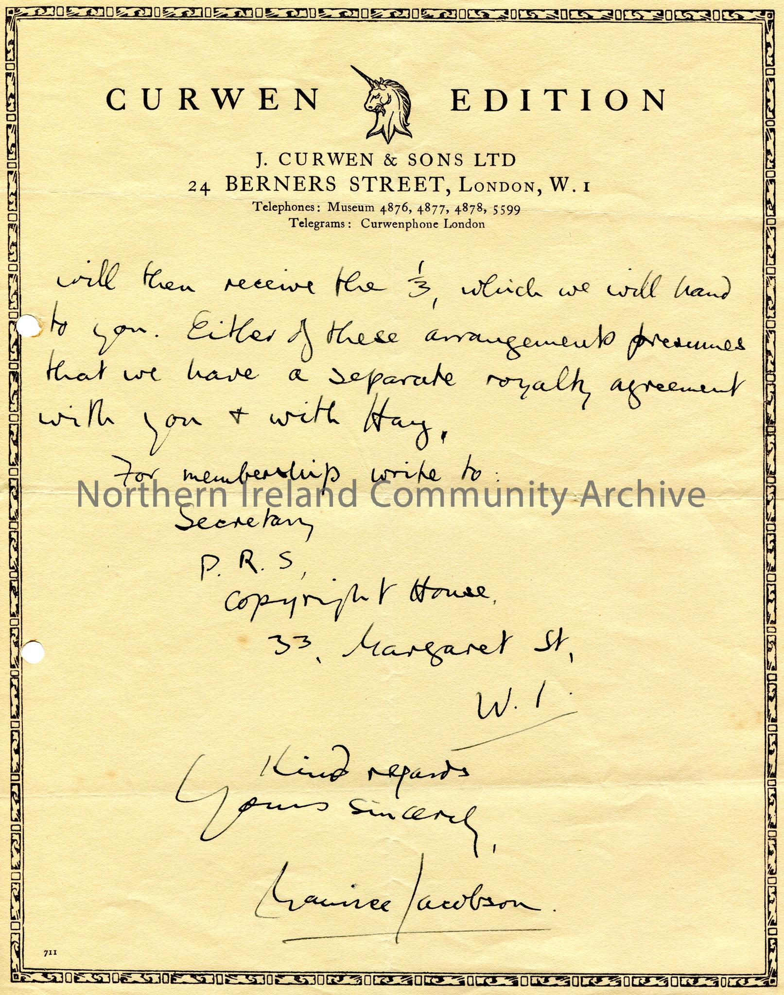Page 2 of 2 of handwritten letter on headed paper and decorative border to Mr Henry. Wants to make clear the position of Sam and John Vine re Sam's songs - 'Broom Besoms' and 'The Little White Cat'. Wants to increase the royalties of 'Buttermilk Boy' after the sale of 500 copies. Also writes re performing fees and the agreement with Hay. Suggests membership of the P.R.S, Copyright House.