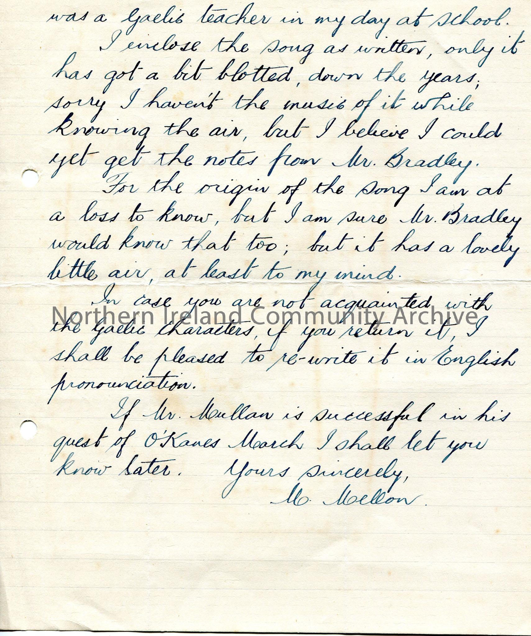 Page 2 of 2 of handwritten letter on lined paper to Sam Henry. Encloses letter from Mr John Mullan re O’Kane’s March. Discusses a Gaelic song, ‘pronou…