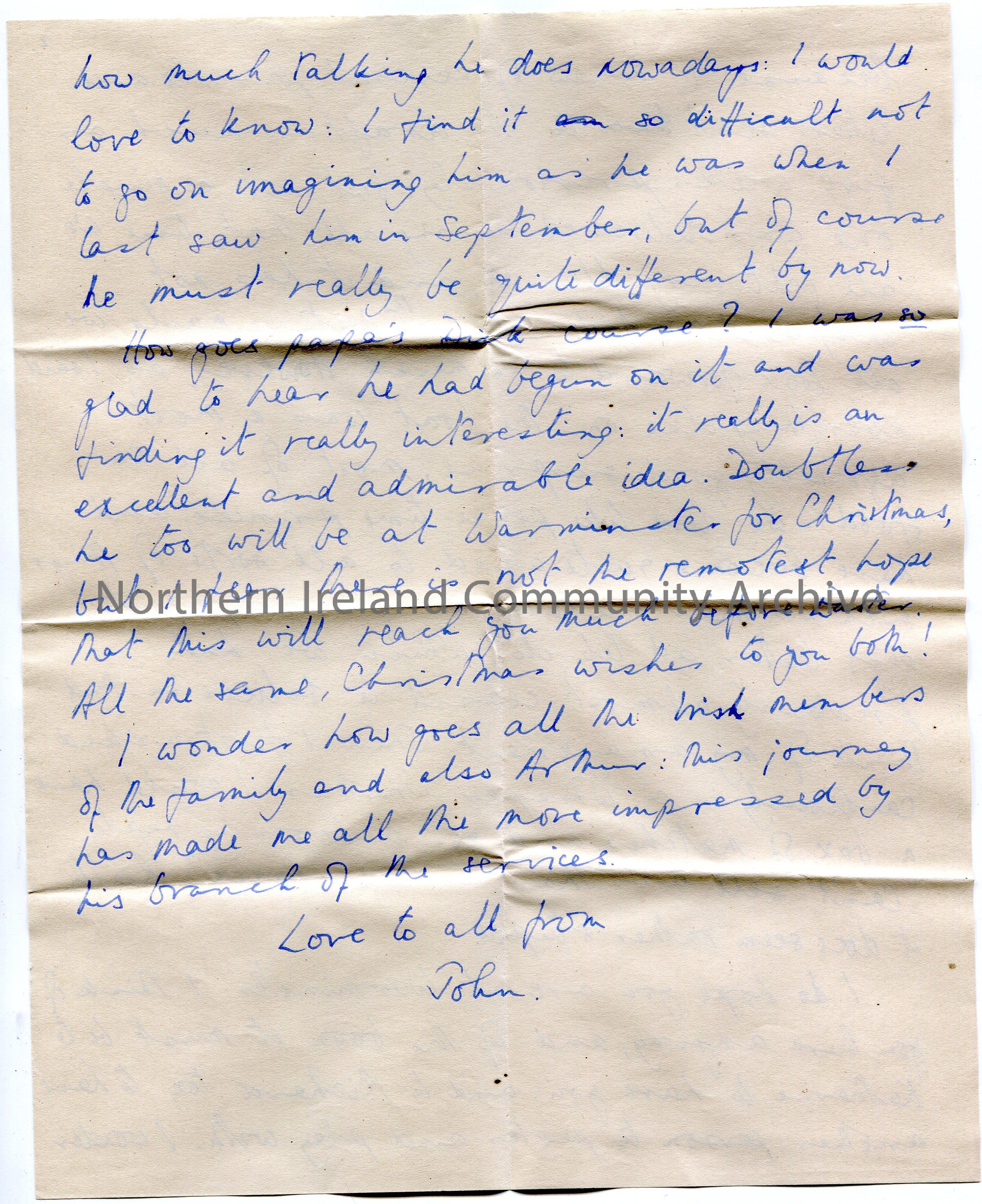 Page 2 of 2 of handwritten letter to 'Dear Mother in law' [Mrs R K Hezlet]. Writes of his medical training in Leeds and Catterick. Reminises of his time spent with Katherine whilst on leave. Complains of the postal service and mail not being received. He was pleased with the food they got on the boat. Mentions a child - Richard - who is learning to talk. He wonders how the 'Irish members of the family' are, particularly Arthur and notes he is 'impressed by his branch of the services'.