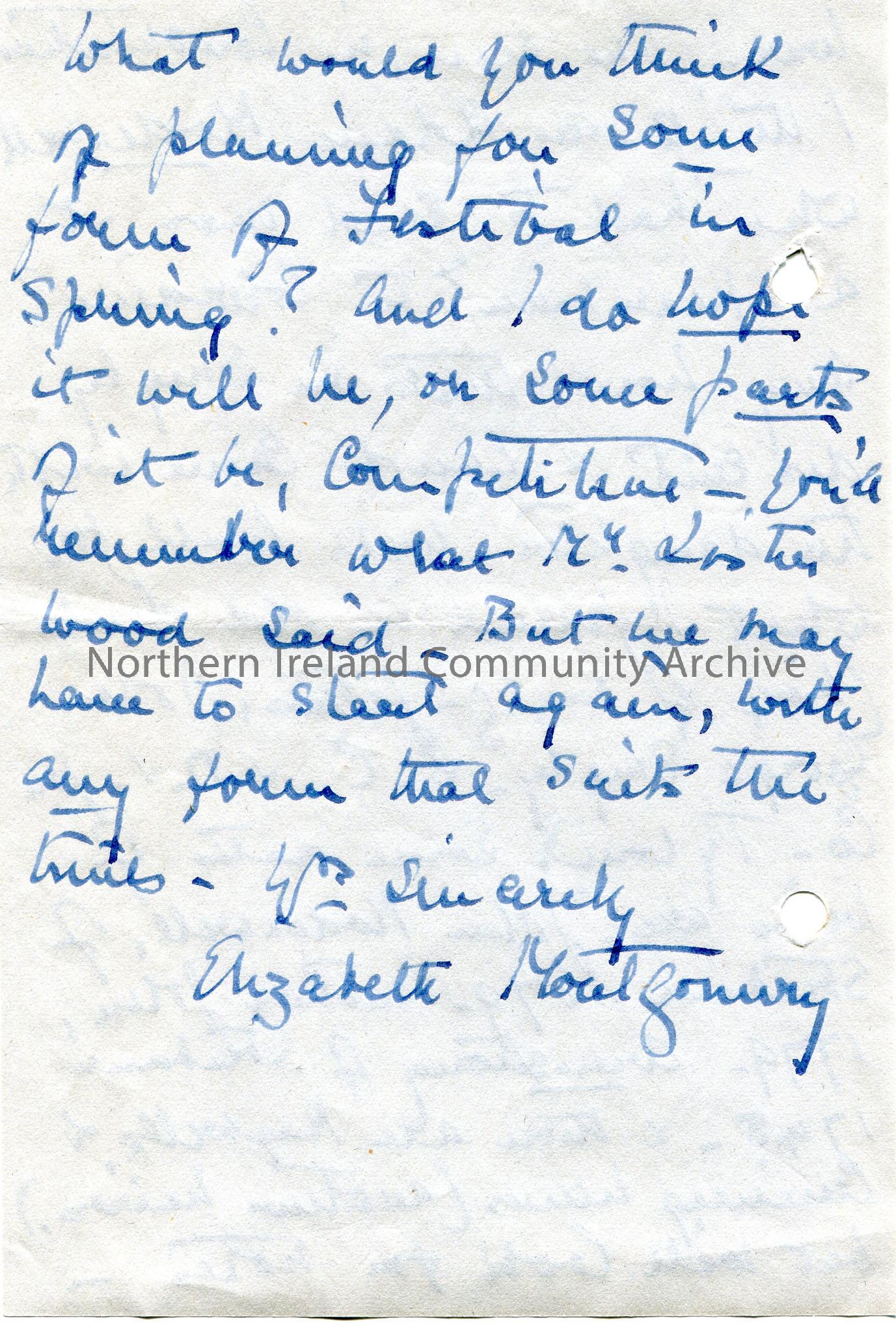 Page 2 of 2 of handwritten letter to Mr Henry. Photographed the McCulloch airs? which were lent to her by Miss Cox. Mentions Mary and Edward Alexander of Portglenone, Houstons of Craigs, Houstons of Red Hill, Adairs of Ballymena. Mentions letters she found and a cousin who died after the war [World War I]. Mentions the Constitution and an Adam Modenwell. Appears to be writing about ancestors. Suggests the formation of a Spring festival.