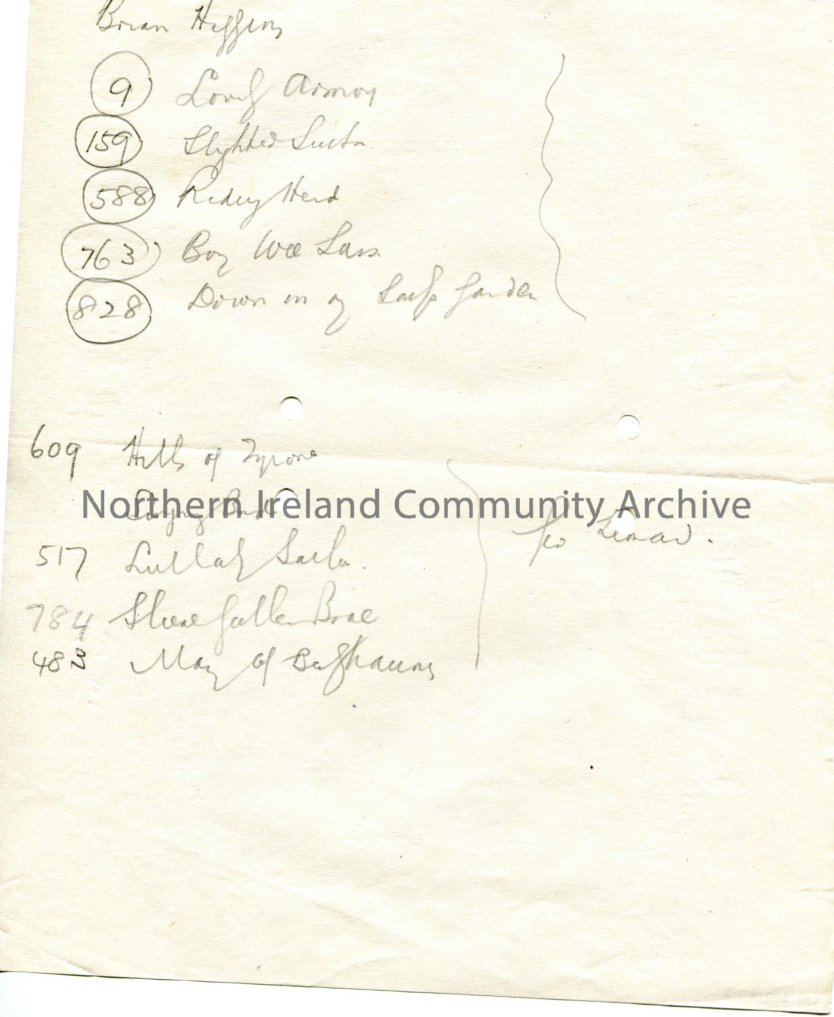 Page 2 of 2 of handwritten list of songs which are numbered and marked as to who will sing them. Singers mentioned are – Robert Irwin, Nan Shaw and Ge…