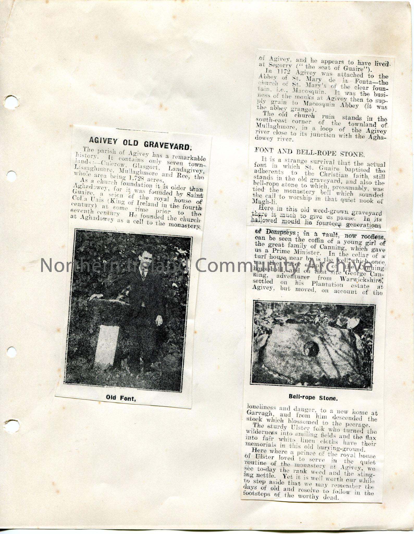 Page 2 of 2 of newspaper cutting of article titled, 'Local Antiquities. Relics of a Great Past. The Broadstone'. Refers to Craigs townland in the Parish of Finvoy, Rasharkin. Mentions Mountsandel, Coleraine. Also refers to Agivey Old Graveyard and the Cannings, Garvagh. Photographic image on page 1 captioned 'The Broadstone'. Two photographic images on page 2 - one is of a man standing beside a font captioned 'Old Font' and another captioned 'Bell-rope Stone'.