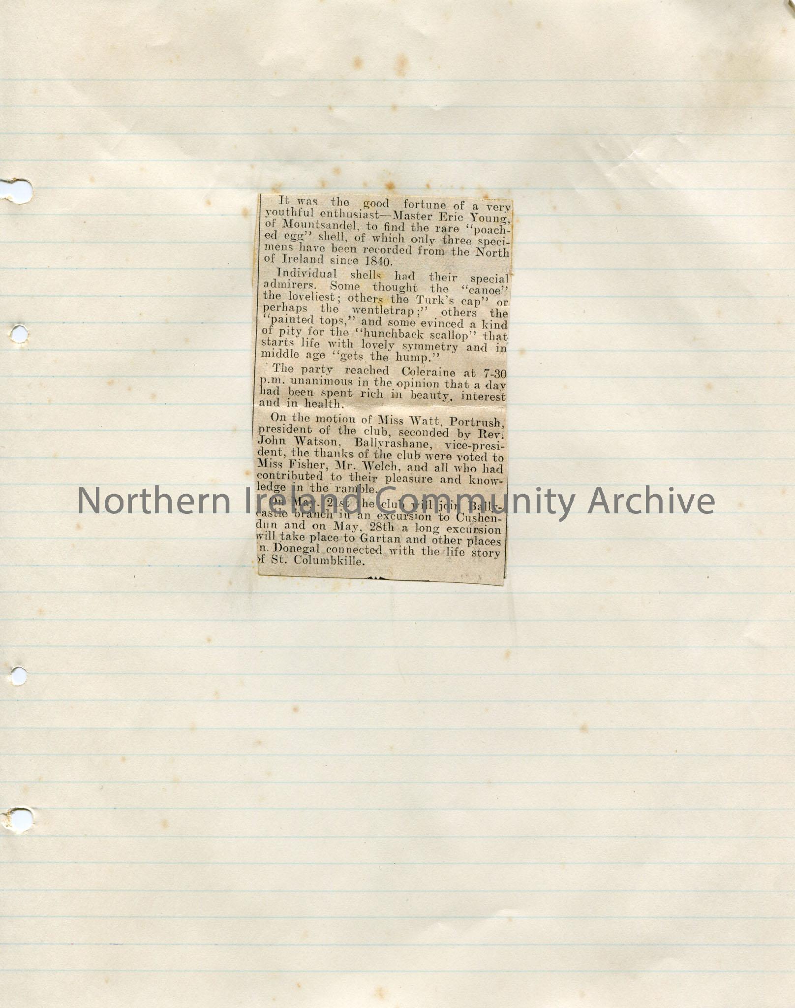 Page 2 of 2 of newspaper cuttings stuck to lined paper titled, 'Route Naturalists' Field Club. Shell Ramble to Magilligan Strand.' Re the second summer excursion of the club along with Miss Nora Fisher of Belfast Municipal Museum, Mr R. J . Welch and Mr R. B. Lindsay. Includes a list of shells found. Miss Watt, Portrush, president of the club while Rev John Watson, Ballyrashane as vice president.