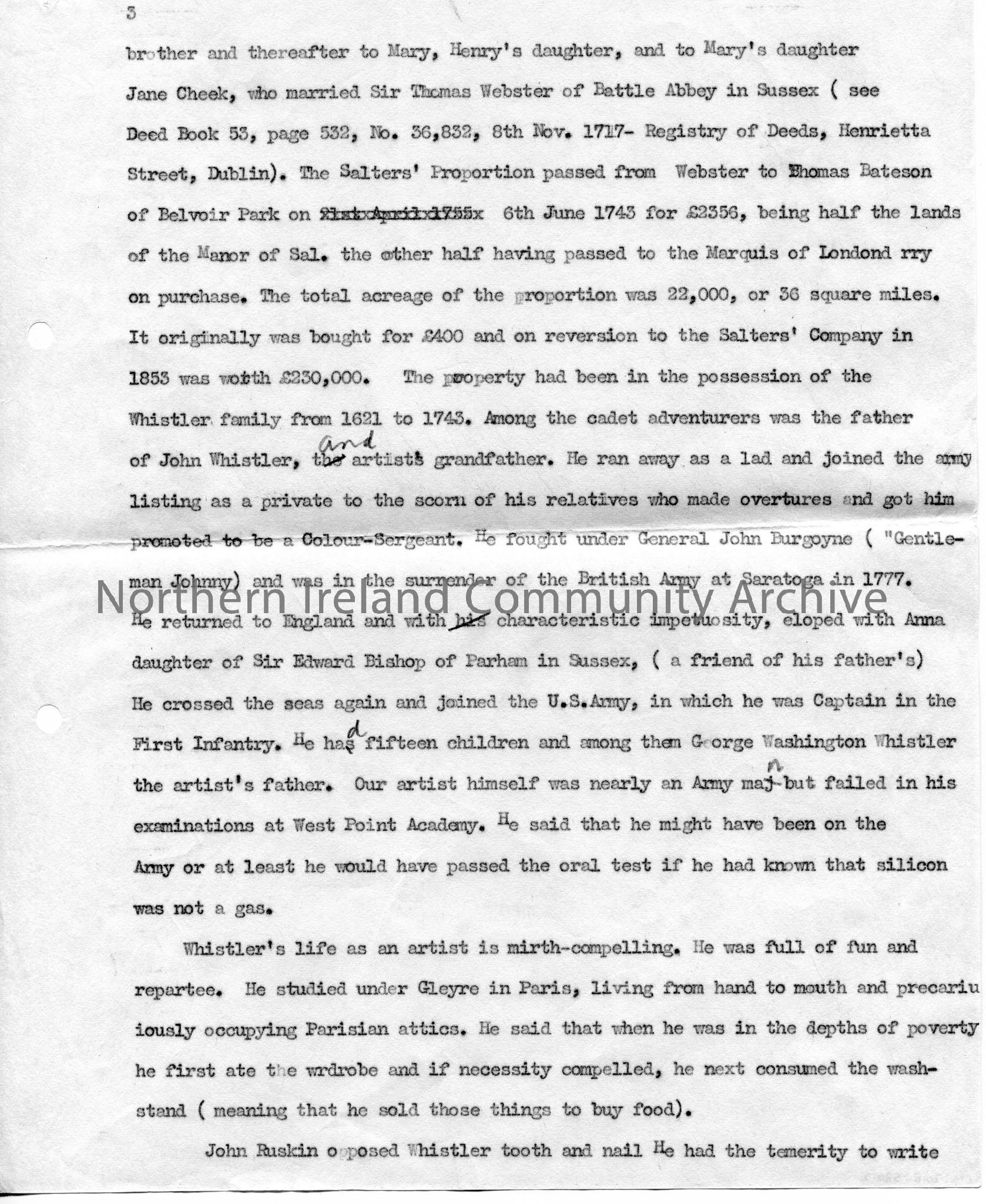 Page 2 of 2 of typed document re the family name Whistler. Possible part of a broadcast. Pages 2 and 3 of a genealogical history of the Whistler in Ulster. Other pages are missing. Pages are annotated in pencil.