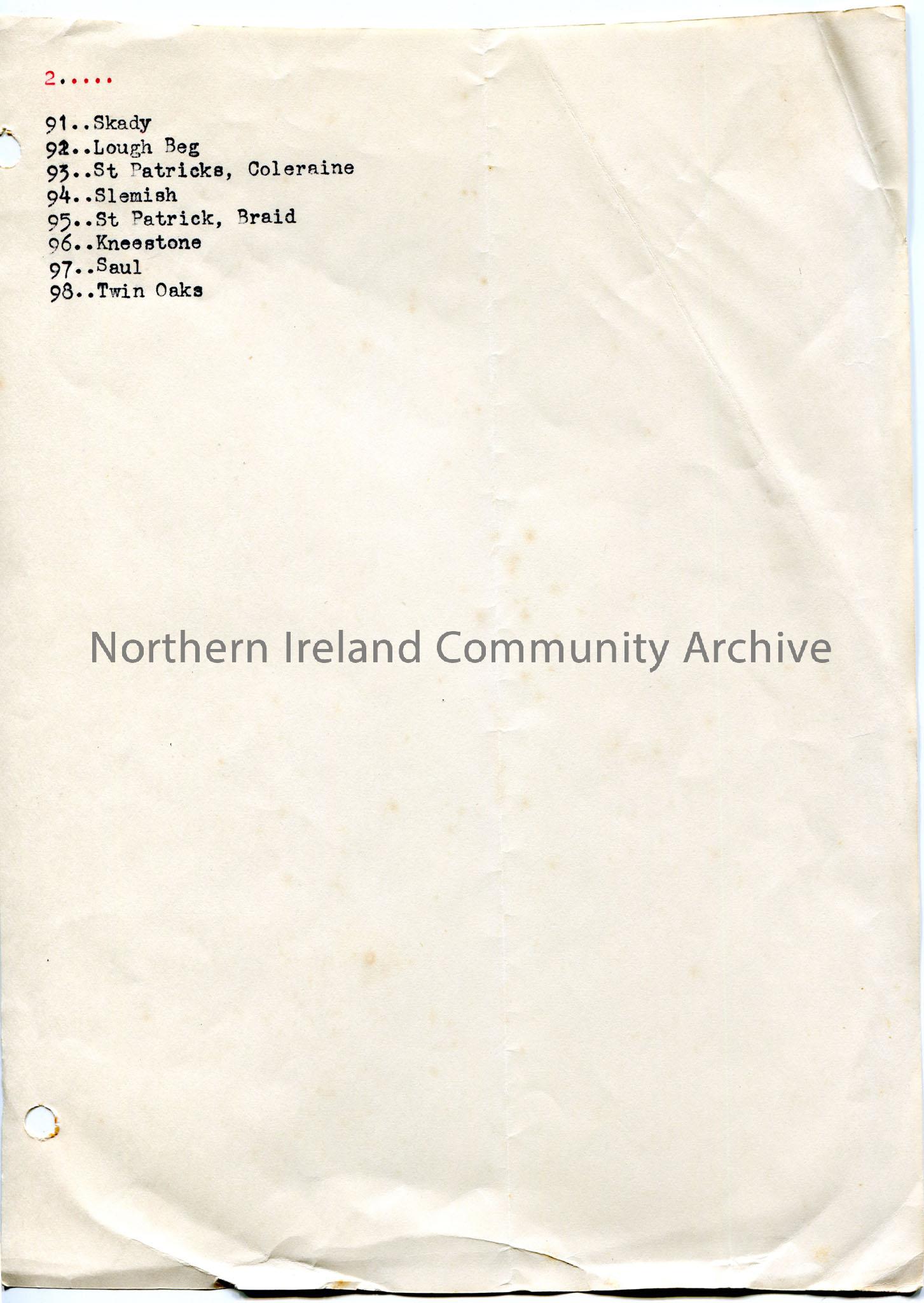 Page 2 of 2 of typed list for a lecture, possibly names of slides, titled, ‘St. Patrick’s Men’s Bible Class. 12th March 1934’. Numbered 1-98.