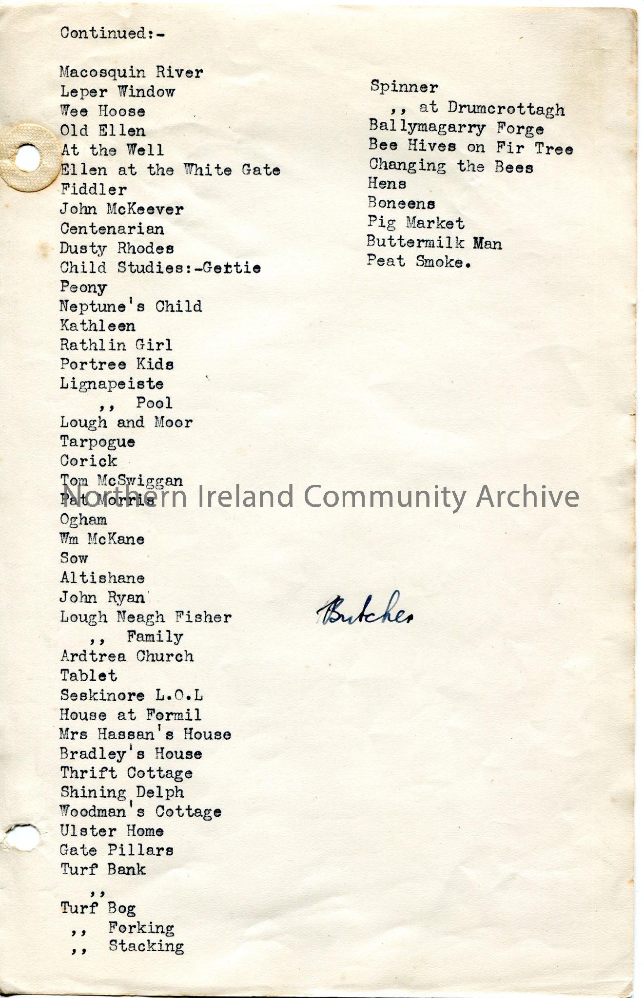 Page 2 of 2 of typed list of slides used in a lecture - 'Ulster Life in Picture, Song and Story'. Page titled, 'Ballymoney - 28th February 1924, St. James' Presbyterian Church Guild'. Newspaper cutting attached to first page titled, 'Ulster Life'- a review of the lecture. States that the evening included the use of lantern slides and signing of songs.