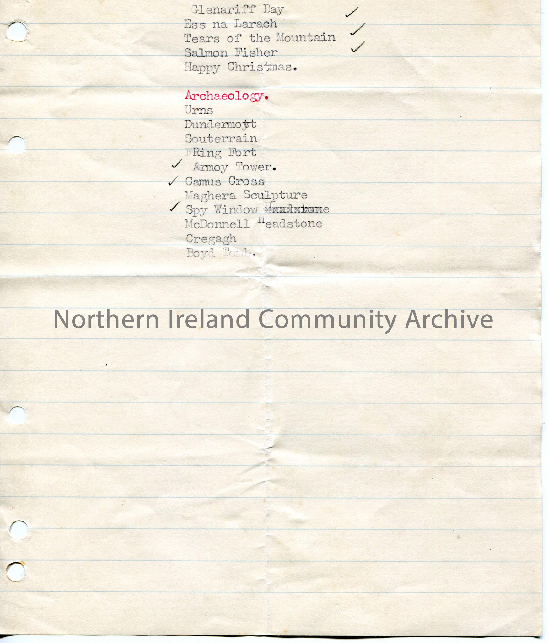 Page 2 of 2 of typed list of various topics for a lecture. Titled, 'Kilrea Women's Institute'. Dated 2nd December, 1937. Salmon, eels, Characters, music, Dunluce, Rathlin Island and archaeology on the second page. Various ticks in pencil beside some words on the list.