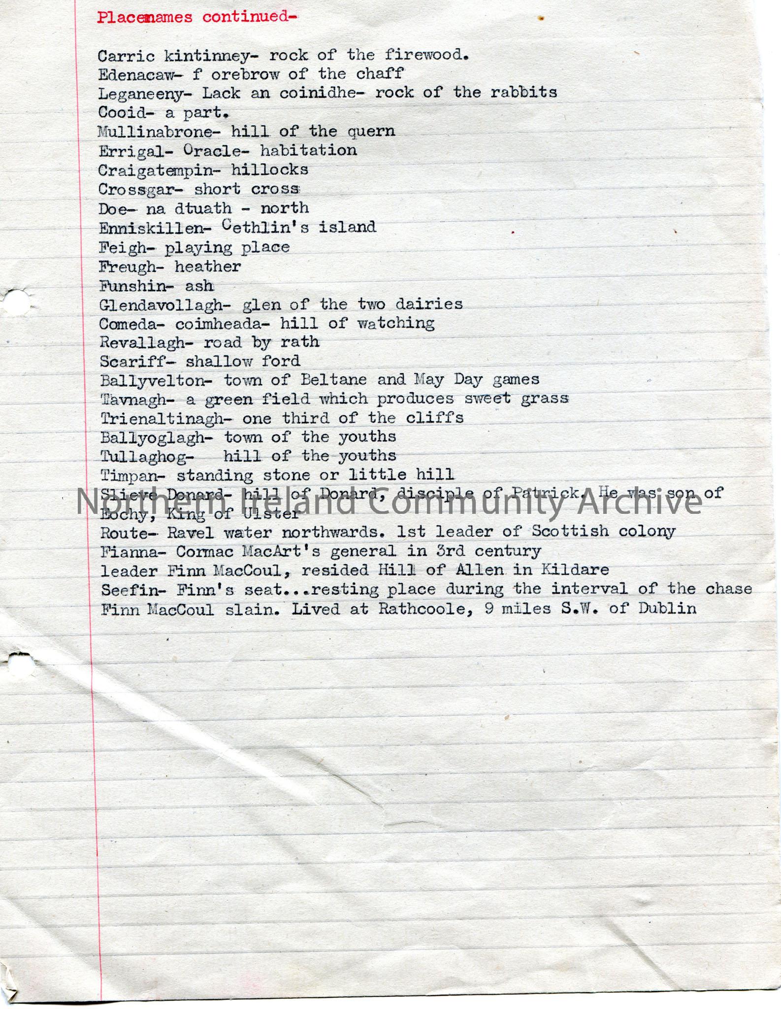 Page 2 of 2 of typed list titled, ‘Placenames’. Placenames and descriptions or meanings.