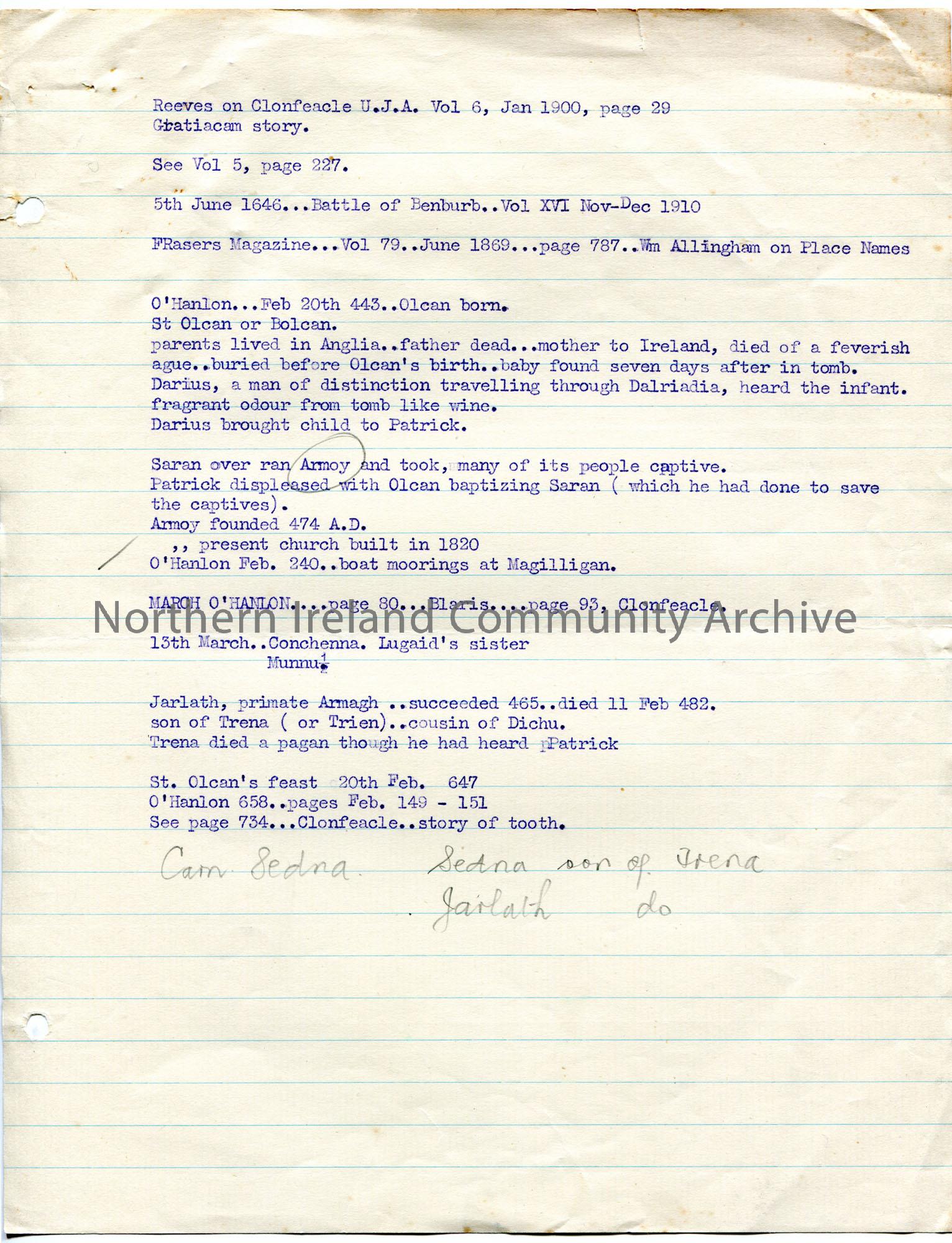 Page 2 of 2 of typed notes re genealogical information re Henry Griffin; legend of Patrick crossing the Blackwater and notes re surname O'Hanlon. Mentions Armoy which is circled in pencil.