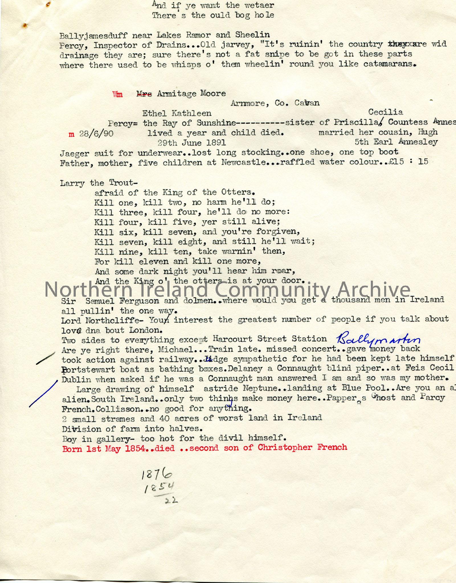 Page 2 of 2 of typed notes re Percy French for broadcast. Notes are marked in pen and pencil. Includes a list of songs and their timings. Mentions Phil the Fluter.