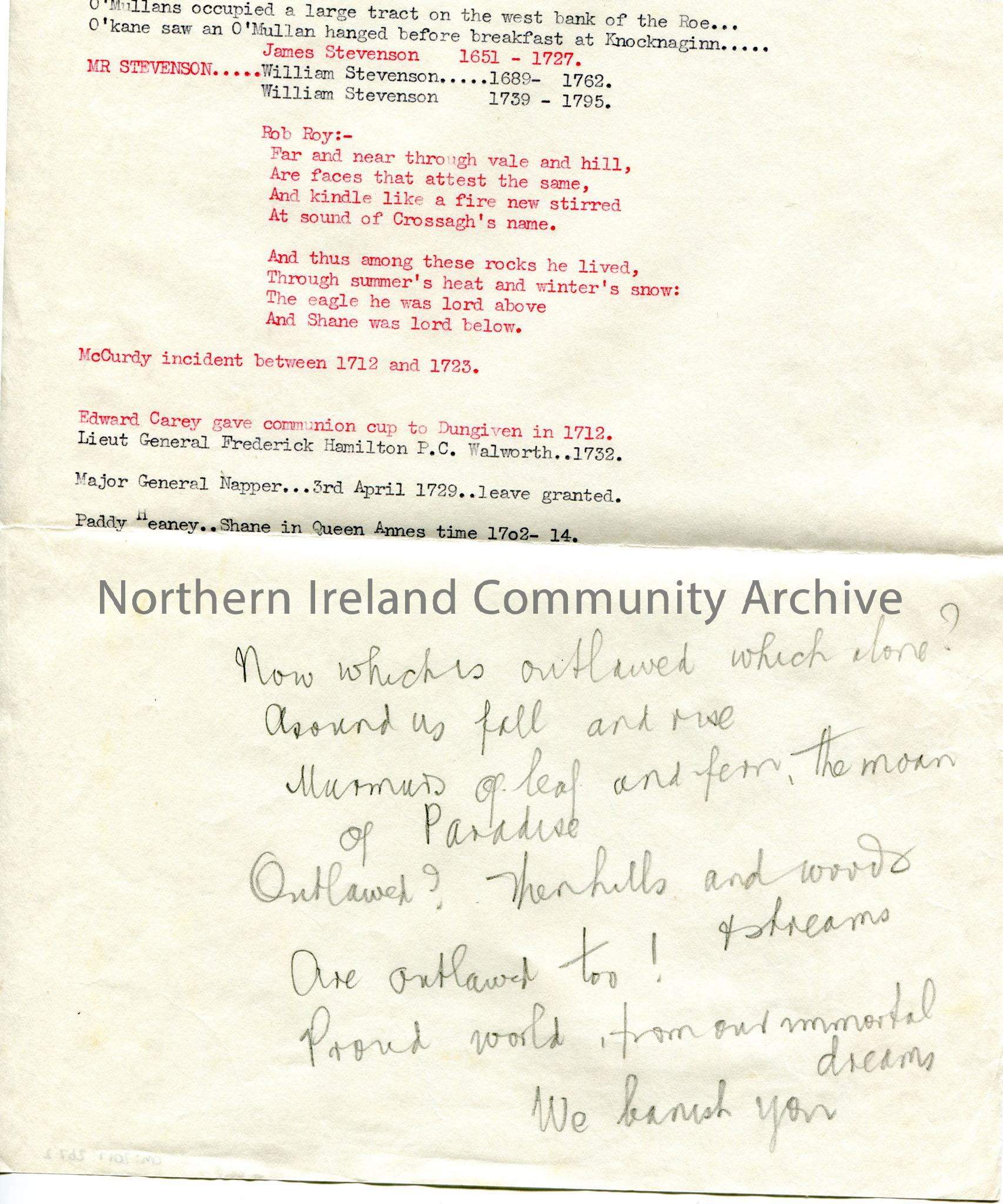 Page 2 of 2 of typed notes re Shane Crossagh. Some words are typed in red. Notes names, dates and events relating to Shane Crossagh. Mentions Paudreen Fad as Shane's right hand man; Sally Mullan (Ned More); Rev. John Law; James Donnelly of Ballymaclanigan; O'Haughan; Pat Conway; Ballydonegan; Roddy Dempsey of Barnilt; Willie McGrath of Ballykelly; blunderbusss, John Wilson; Edward Carey; Harry Evans; O'Mullan; McCurdy; Lieut General Frederick Hamilton; Major General Napper; Paddy Heaney. Includes 2 verse poem or words to song titled 'Rob Roy'. Handwritten notes in pencil on page 2 which refers to something or a person being outlawed.