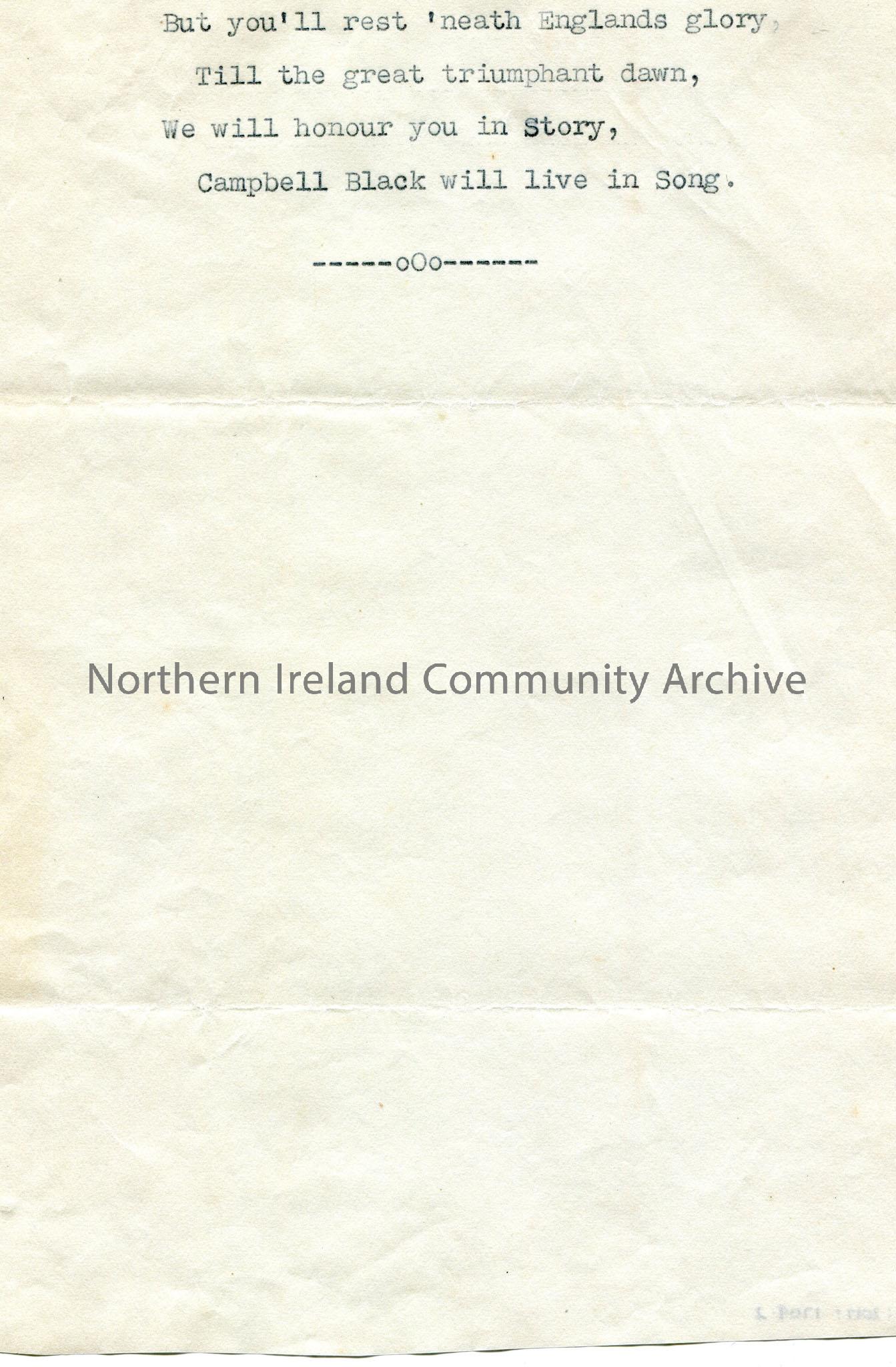 Page 2 of 2 of typed poem or words to song re the death of Captain Campbell Black, Airman who was killed taxi-ing a plane from the hangars aerodrome near London.