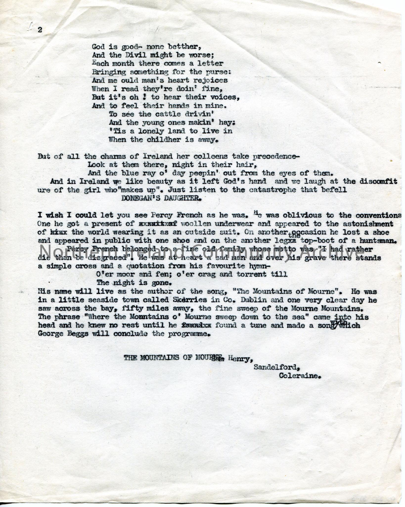 Page 2 of 2 of typed script for the BBC North American programme re Percy French. Sent to Miss Ursula Eason at the BBC for amendment along with letter…