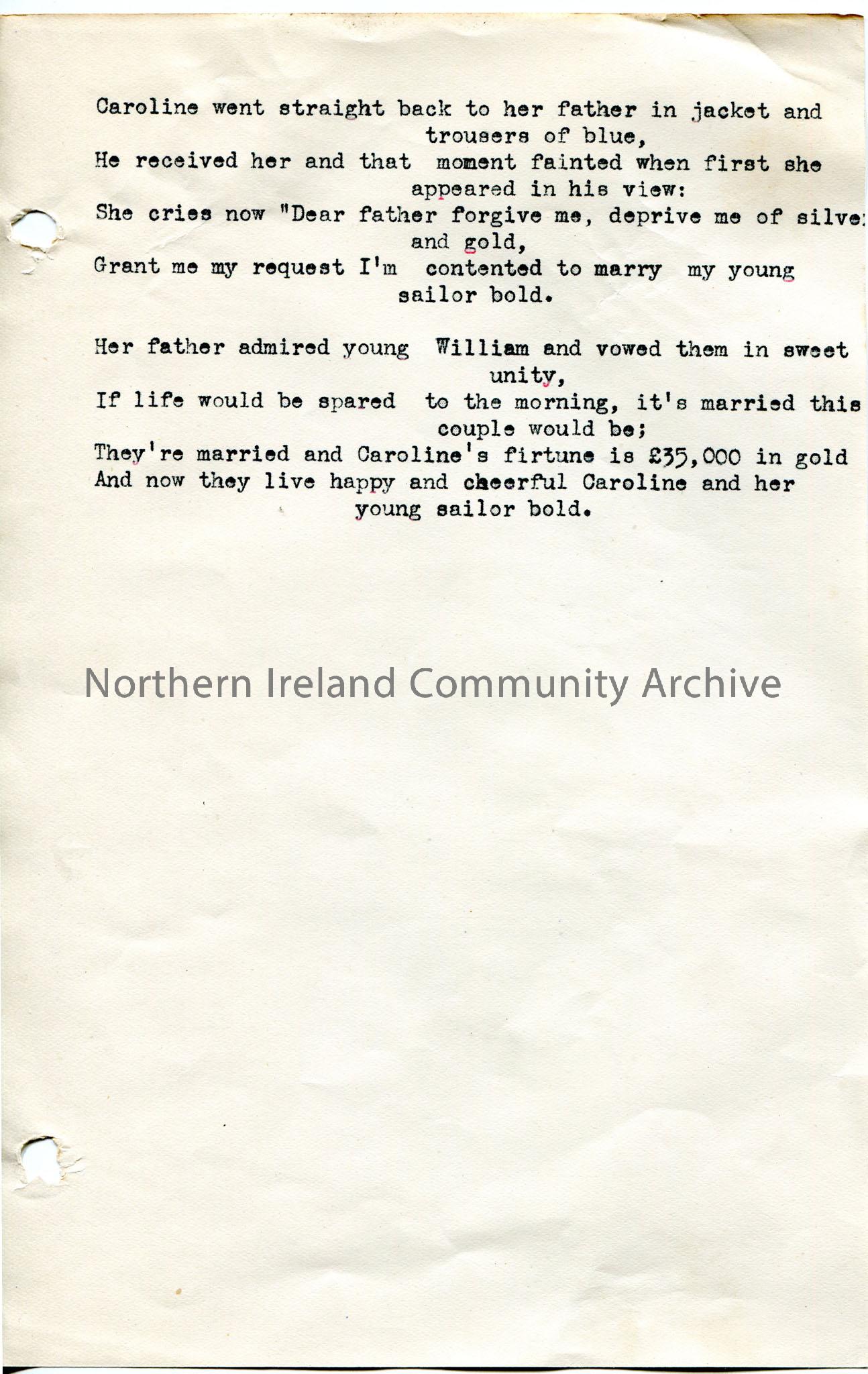 Page 2 of 2 of typed song titled, ‘A Young Sailor Bold’. From Rose E. Hasson, Ballymonie, Altmover, Dungiven. Tune…The Banks of Kilrea’.