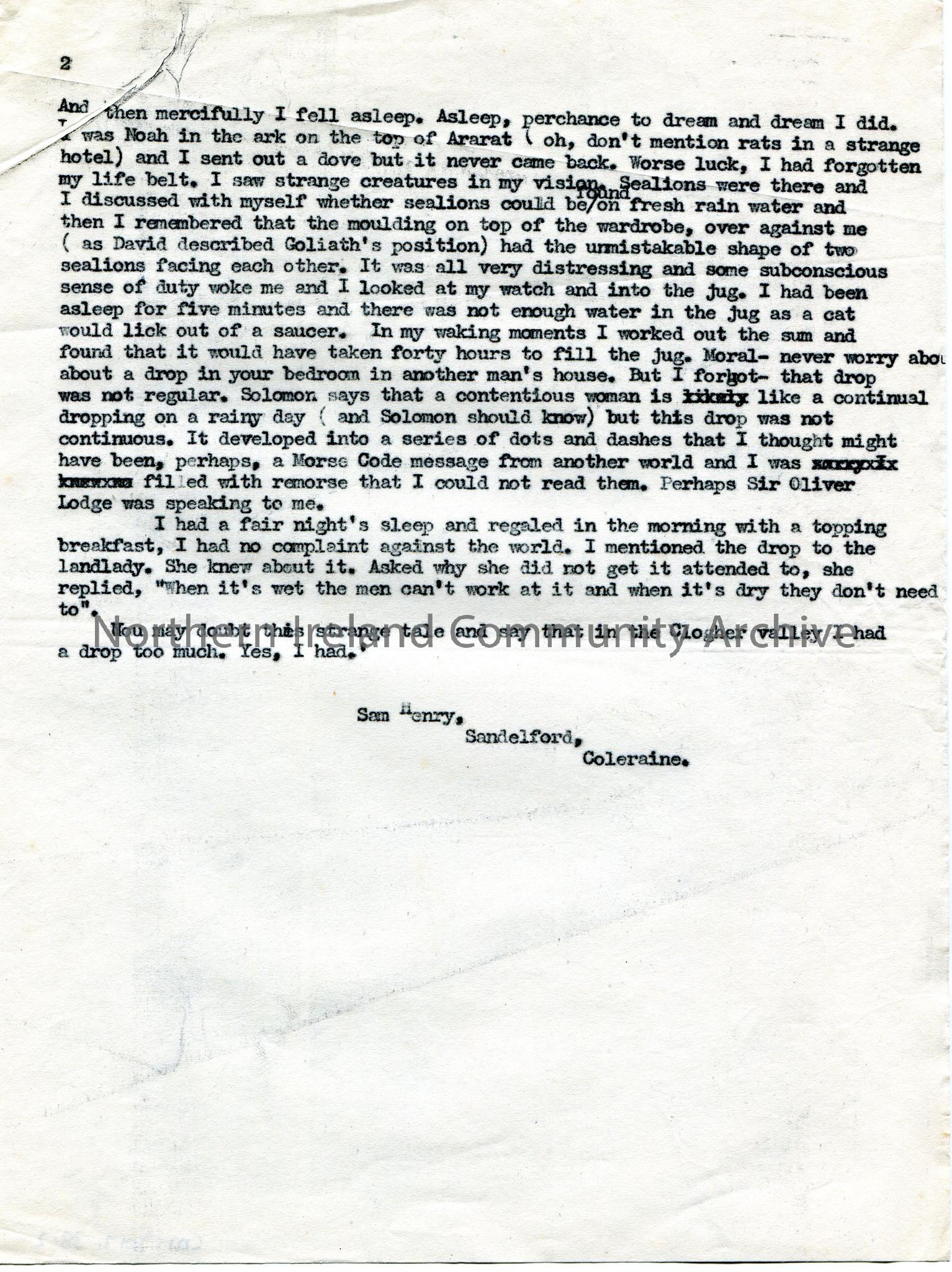 Page 2 of 2 of typed story re Clogher Valley. Titled, 'The Down-Drop. A Hint for the Sleepless'. Sam Henry describes an overnight stay in a hotel in the Clogher Valley after spending the day with the Portadown Rotary Club and searching for a headstone to a blacksmith in Cromwell's army. He describes how a drip of water from the ceiling kept him awake.