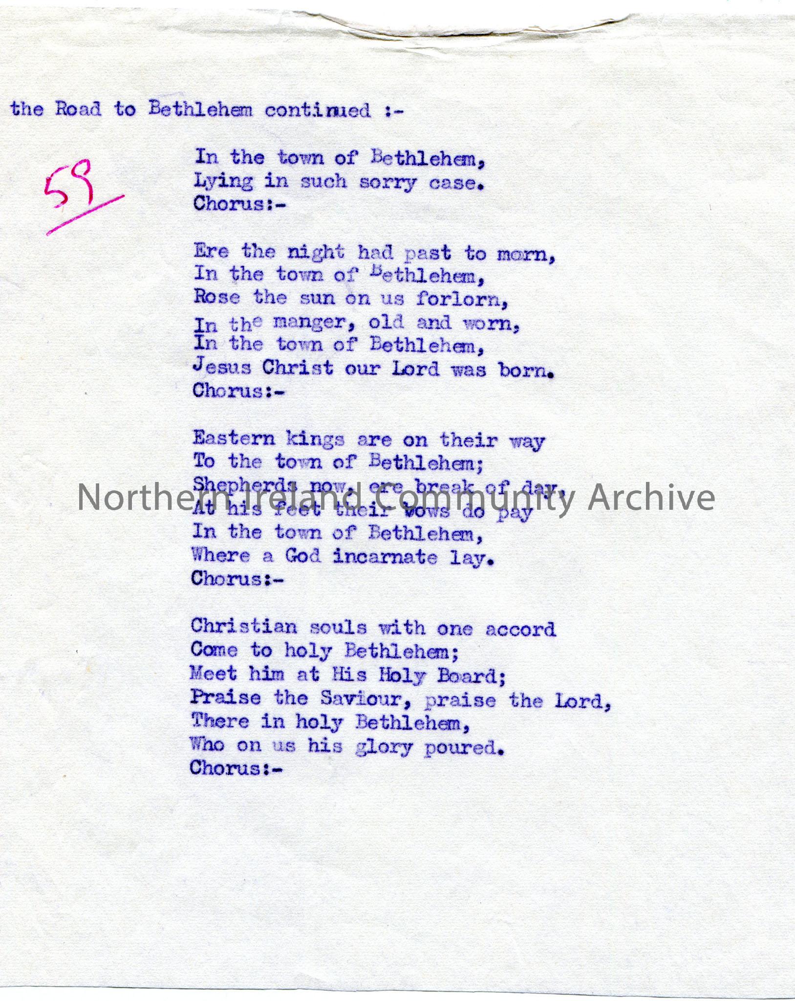 Page 2 of 2 of typed tonic sol-fa notation and words to song titled, ‘No. 59 – On the Road to Bethlehem’.