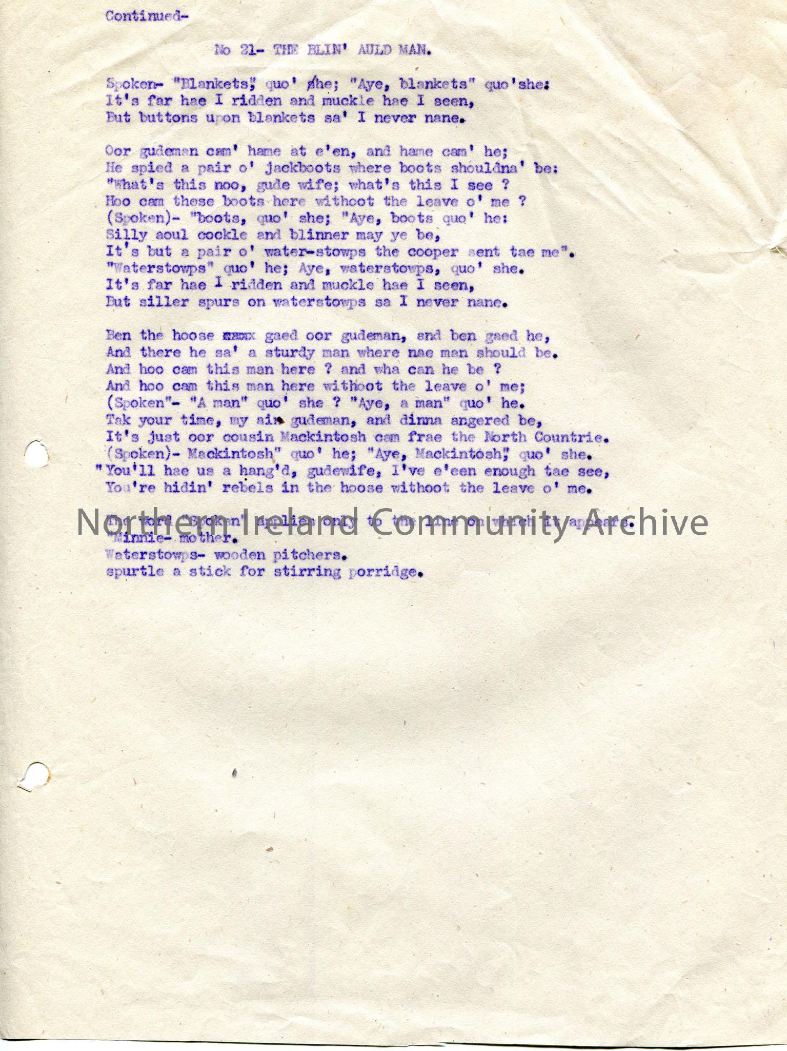 Page 2 of 2 of typed tonic sol-fa notations and words to song titled, 'No. 21 - An Auld Sang In Braid Scots. The Blin' Auld Man: or The Covered Cavalier'. The first tonic sol-fa notation was taken from Sally Doherty, Magilligan and the second from W.T.Hay, Coleraine.