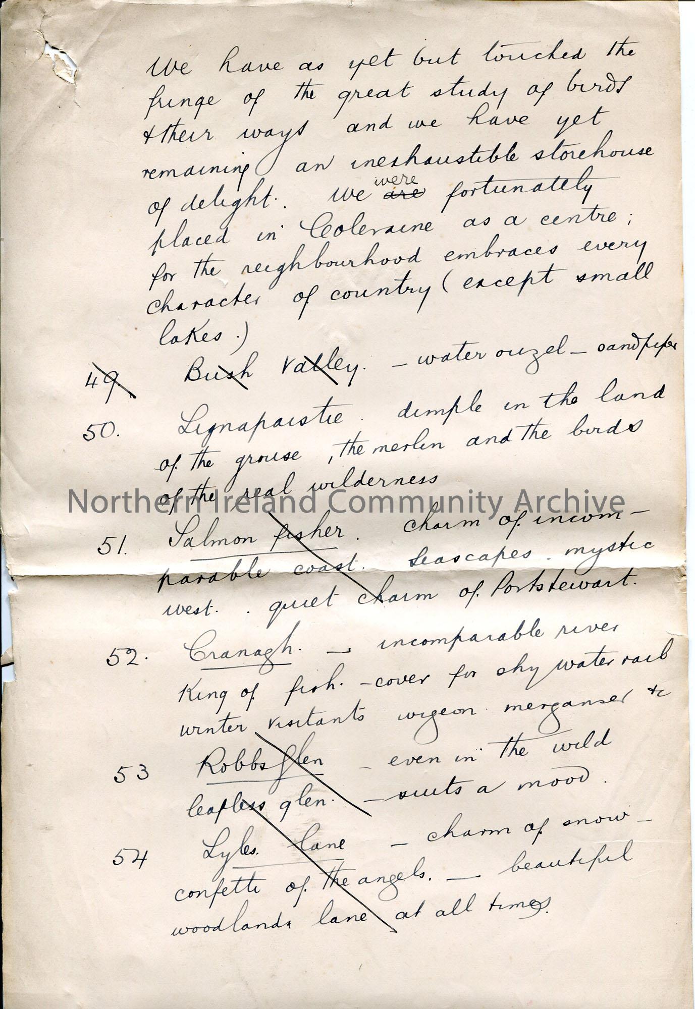 Page 2 of 2. Page as part of a lecture [other pages missing]. Handwritten lecture re birds. Mentions Bob McCurry and the salmon fisheries, Cranagh, Robbs Glen and Lyles Lane, all of Coleraine. Points numbered as if for slides 44-54.
