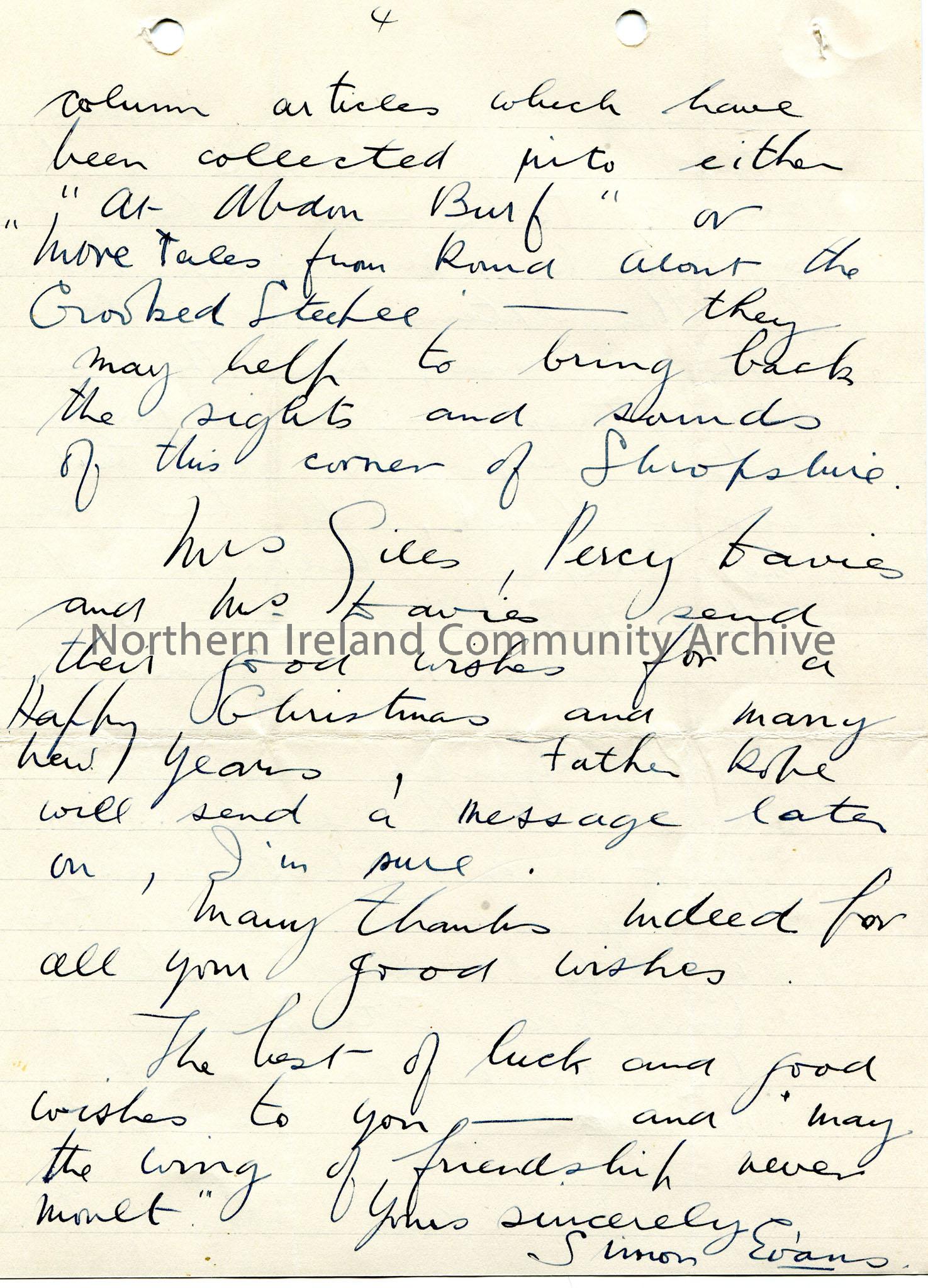 Page 2 of 2 pages of handwritten letter, double sided, to Sam Henry. Thanks Sam for sending letter and books. Sent 'Tales of the Antrim Sea board' to Father Rope and is waiting on reply. Refers to Sam's 'Antrim Keepsake' as a reminder of meeting with Sam. Writes that many people have enquired about Sam. He was glad Sam looked back at his work the 'Crooked Steeple' with pleasure. Writes about a chocolate and sweet talk to happen on 16th January. Speaks of an upcoming talk of his own on Shropshire place names and life around the Crooked Steeple. Enclosed two or three articles to remind Sam of Shropshire. Sends his luck and Christmas wishes.