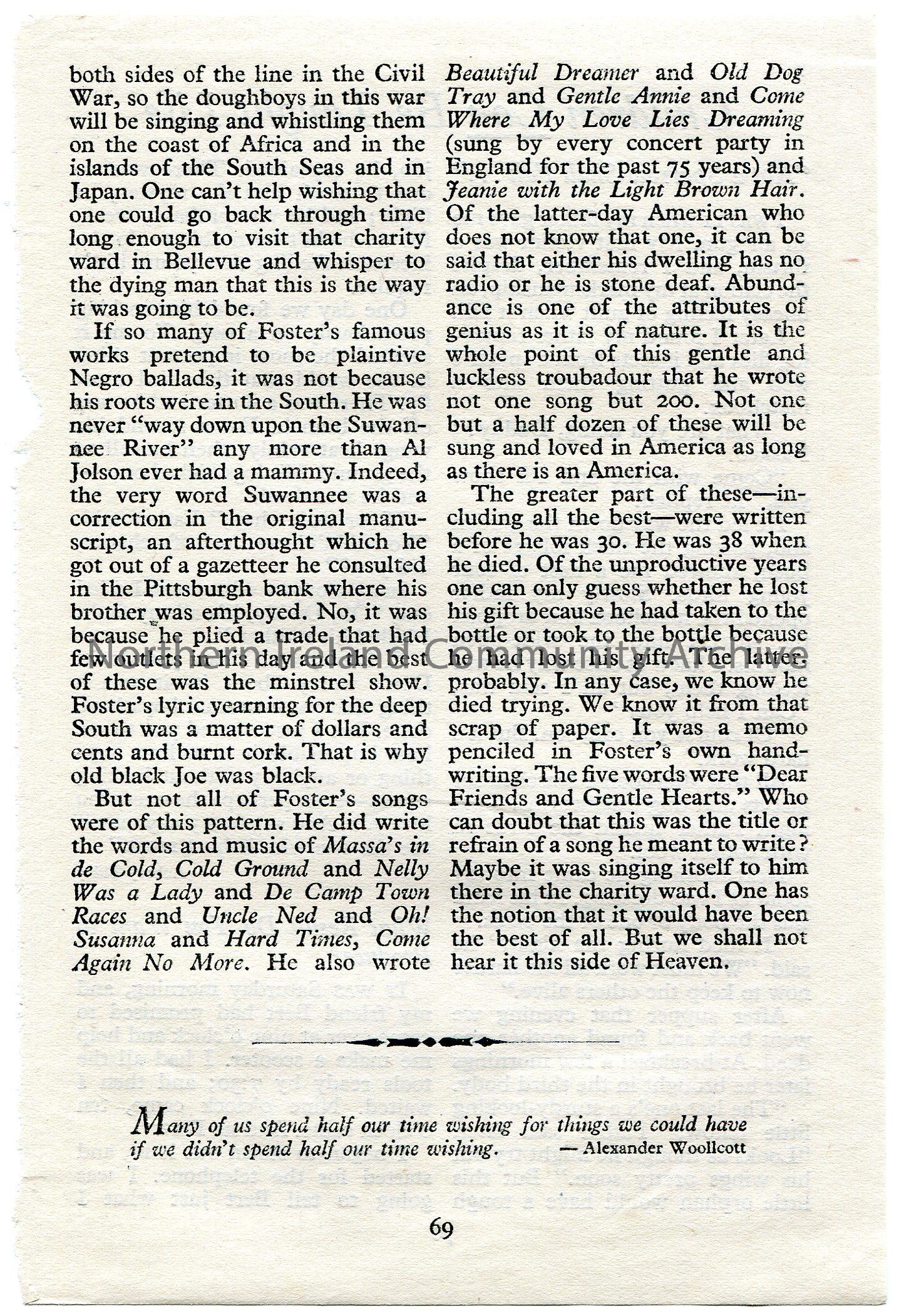 Page 2 of 2. Printed page from a book - page 69-70. Re an article titled, 'Dear Friends and Gentle Hearts'. By Alexander Woollcott. Re Stephen Collins Foster and the legacy of his songs in America.