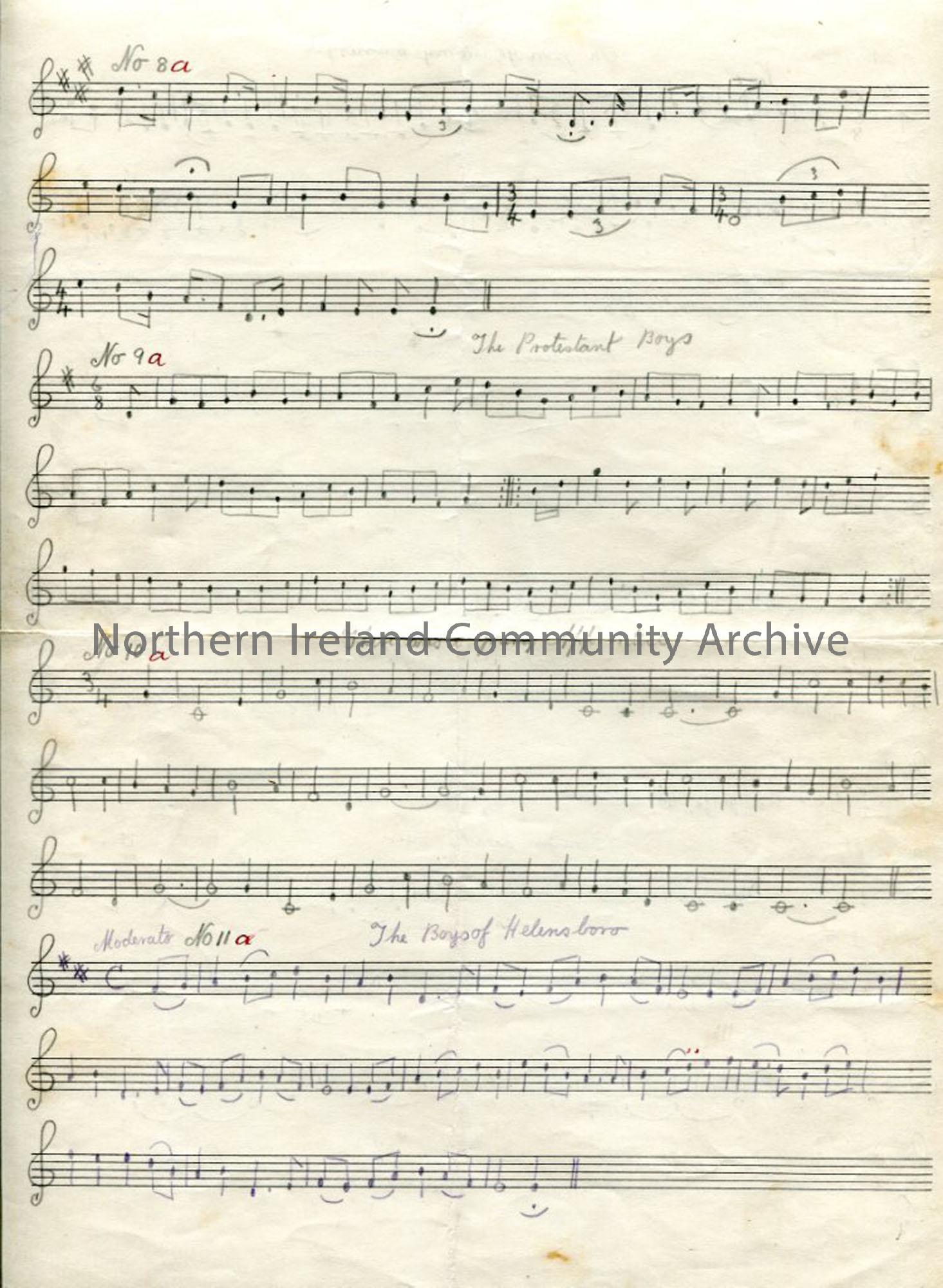 Page 2 of 2 - Sheet of hand drawn staff notation to various tunes. Including: 'Divis Mountain', 'Carnlea Crimson Banner', 'Cloughwater Orange Maid', 'It was in London Fair', 'The Protestant Boys' and 'The Boys of Helensboro'.