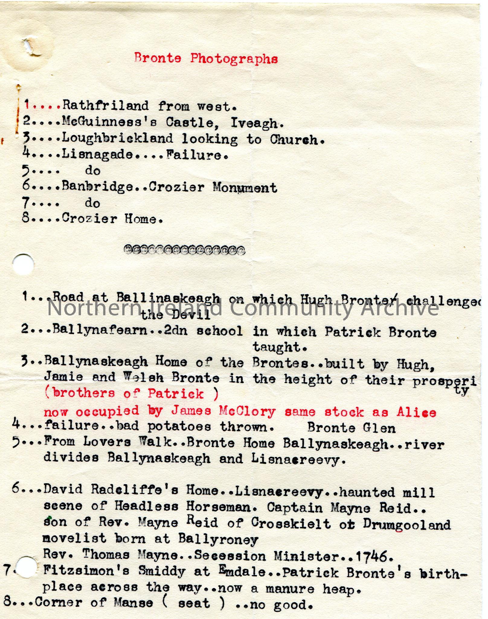 Page 2 of 2 titled, ‘Bronte Photographs’. Numbered lists which give details of places and names.