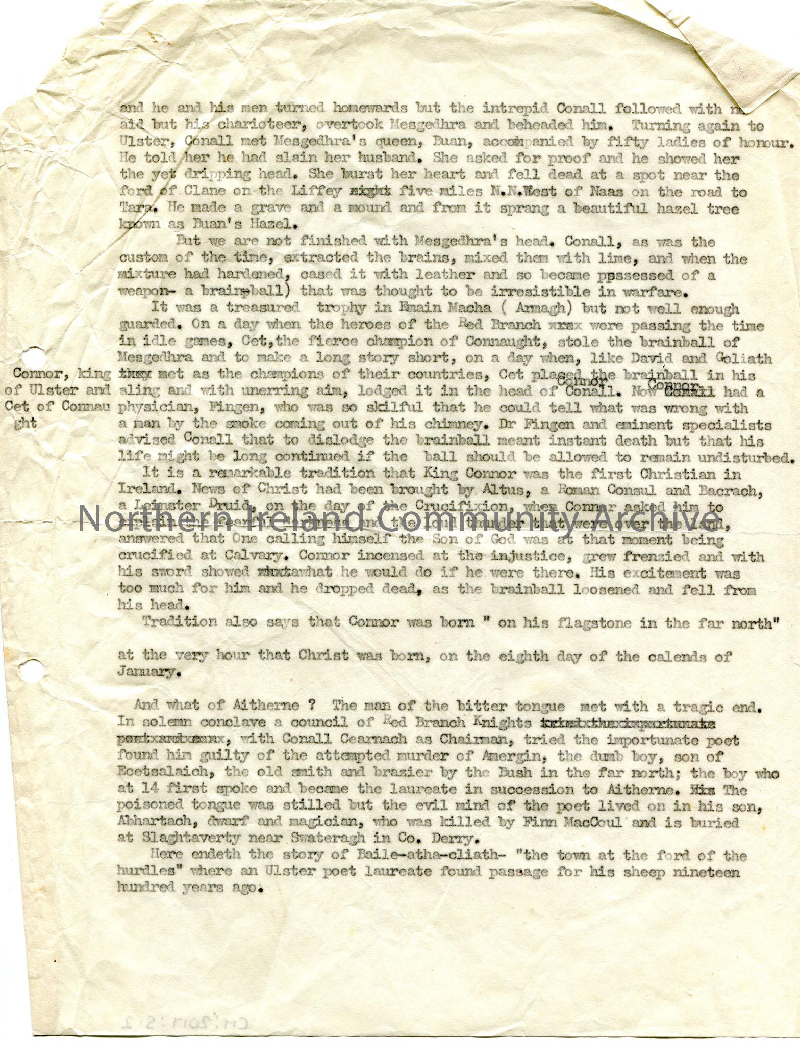 Page 2 of 2 typed document titled, 'How Dublin Got It's Names. The Ford of the Hurdles'. Explains the different names that Dublin has been given. Writes re the poet laureate of Ulster, Aitherne Ailghesach, who later became ruler of Leinster. Refers to Mesgedhra, King of the Leinstermen and Conall Cearnach, Red Branch Knight, commander of the Ulstermen and who lived at Dunseverick. Refers to a warfare weapon, 'brainball', brains wrapped in leather.