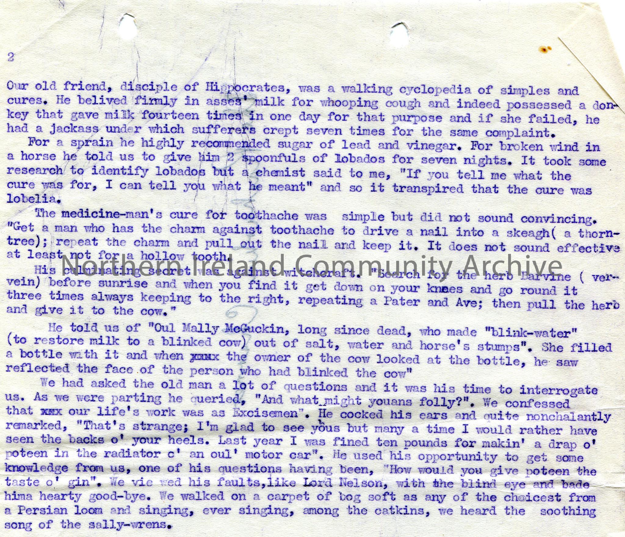 Page 2 of 2 typed document titled, 'Old Time Cures. The Path Through the Moss'. Re a trip with a friend to Liscoogan Moss. Describes various birds in their environment. Wants to know of any stories re Finn MacCoul. Met an old man who told them of various cures such as taming a horse, cures for toothache, sprains, whooping cough, witchcraft and other cures. 'The Rasharkin Charmer' handwritten on back of second page.