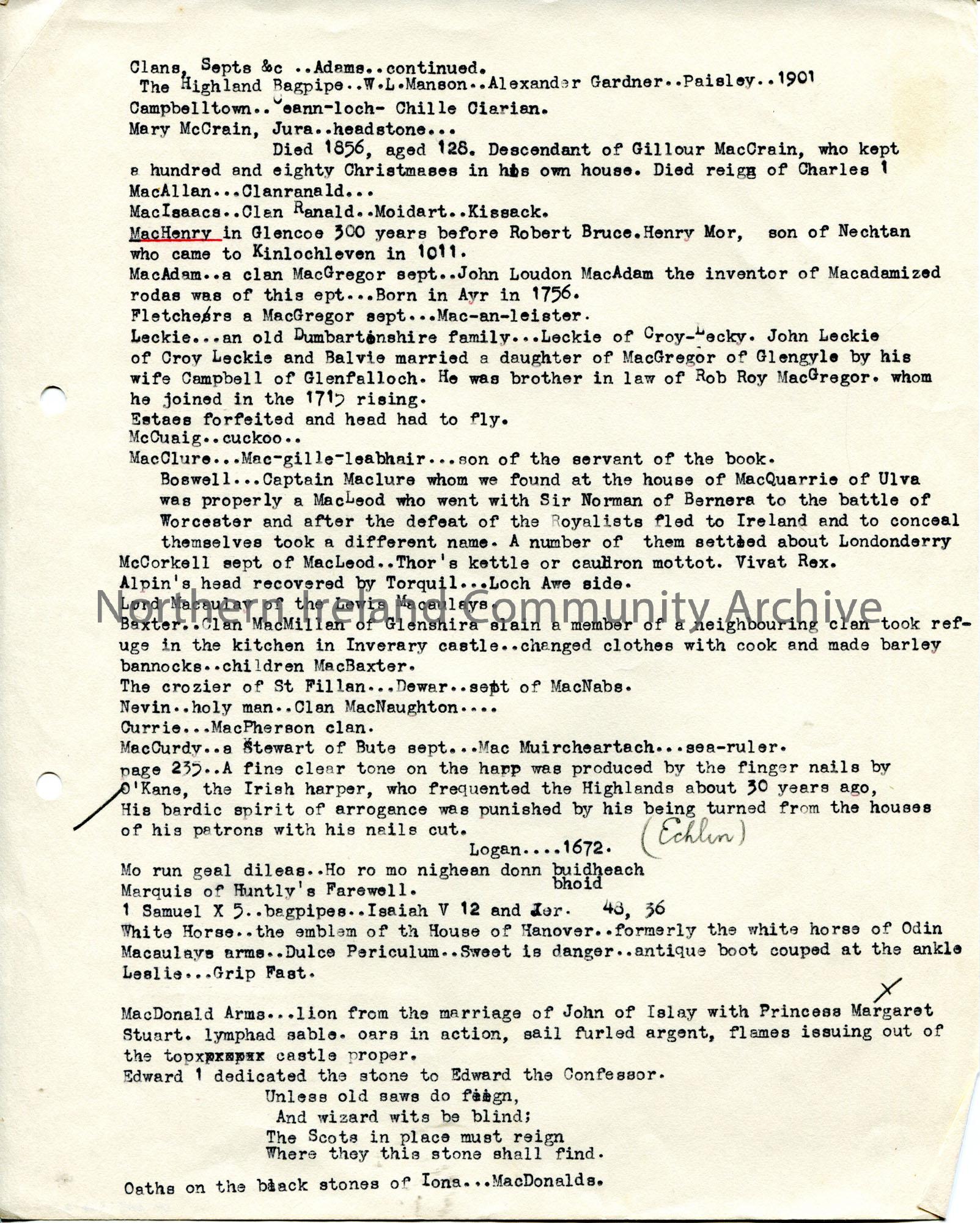 Page 2 of 2. Typed extracts from book titled, ‘The Clans, Septs and Regiments of the Scottish Highlands’ by Frank Adam, 1924.