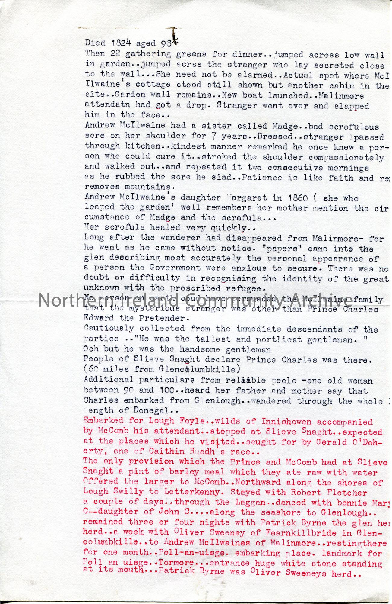 Page 2 of 2. Typed extracts from ‘Dublin University Magazine’ September 1860. Re Glencolumbkille and Prince Charles.